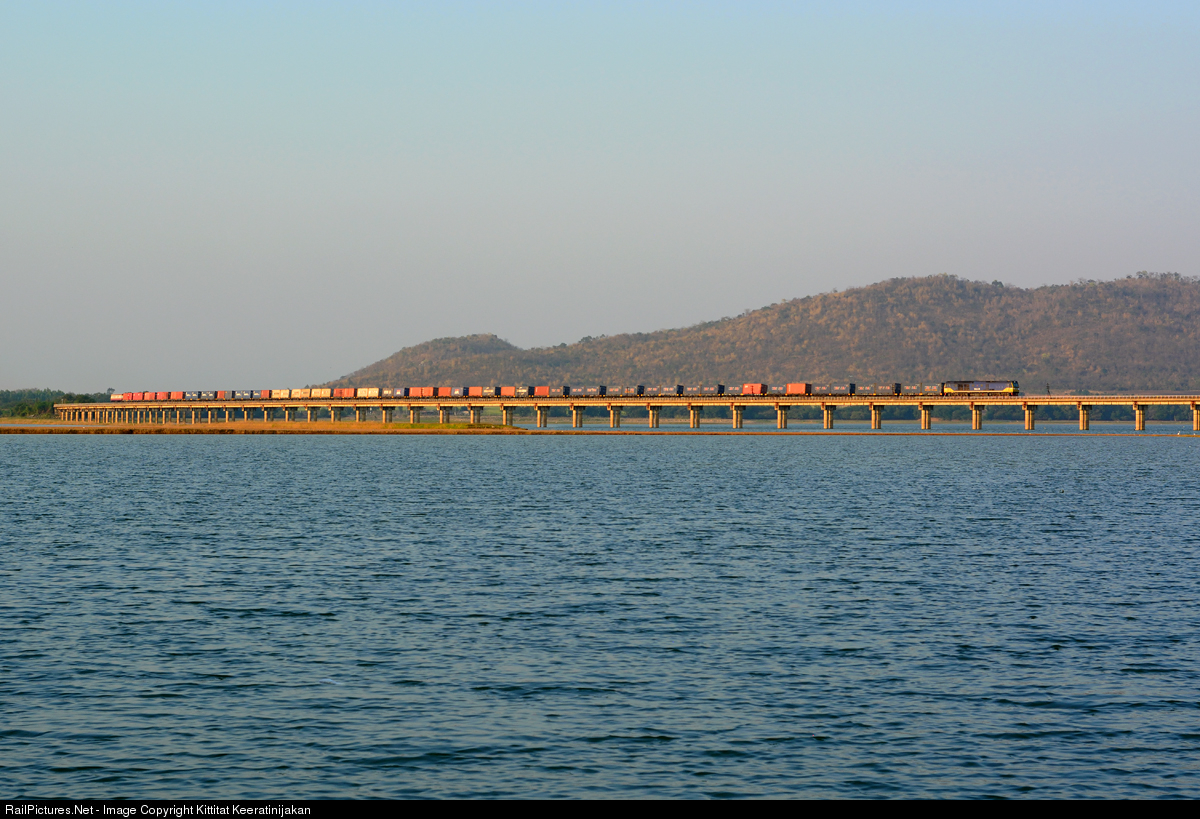 | Chinese-built CSR SDA3 No.5118, with container train from Nong Khai to Laem Chabang, while crossing a viaduct at Pa Sak Jolasid Dam. |