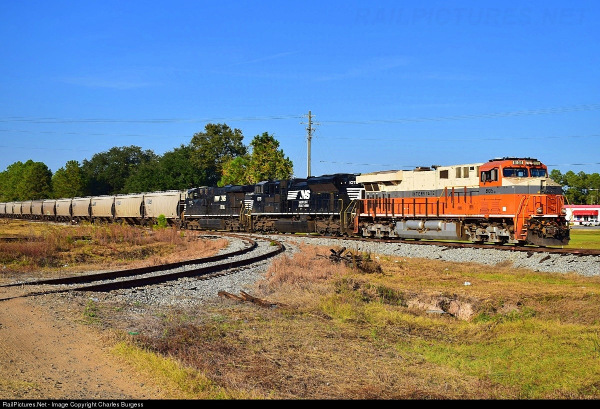 The Interstate Heritage Unit leads a Norfolk Southern unit grain train bound for the Flint Hills ethanol plant near Pelham, Georgia. At one time, there was a diamond at this location where the GAS&C (later Southern and Norfolk Southern) crossed the Atlantic Coast Line.