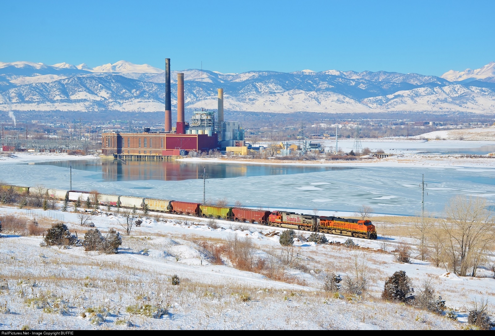 | A fresh layer of snow has fallen across the Colorado Front Range, making for this scenic winter wonderland for BNSF 6195 (ES44AC). It leads a legit Warbonnet (note it says Santa Fe and not BNSF on the side) and a string of freight past the Valmont Power Plant in Boulder, Colorado. |