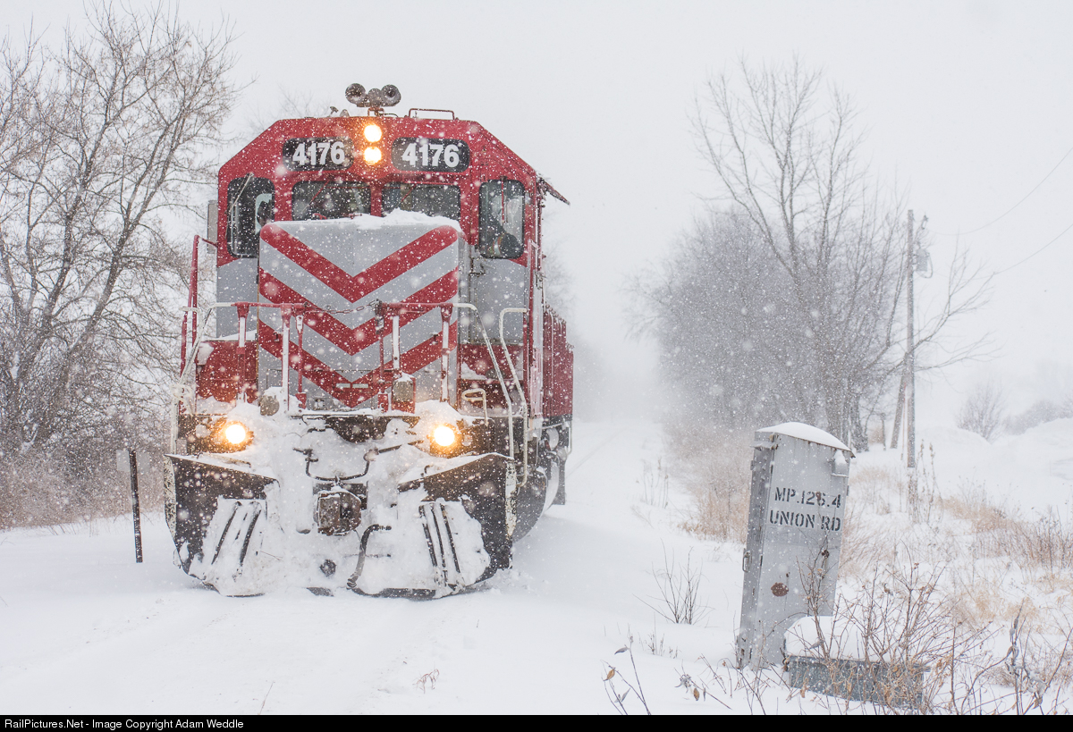| WAMX 4176 is heading West between Brooklyn and Oregon, WI. They ran the power all the way to the red board to ensure that the conductor knew exactly where said red board was located, and to check that the flange ways were clear of snow and ice. Once they get back to Oregon, they will shove 100 empty oil cars down this former mainline for storage. |