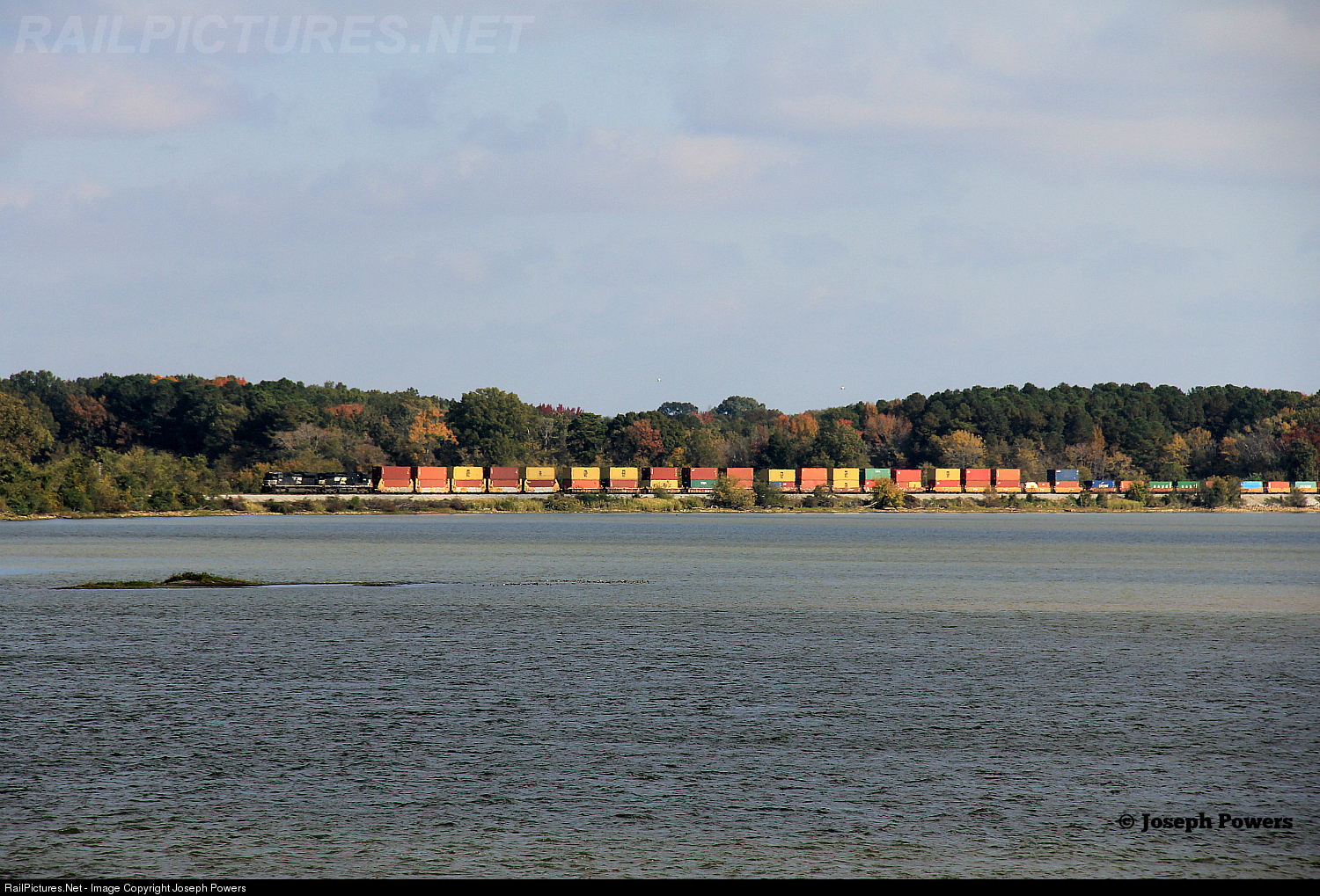 | Westbound Norfolk Southern intermodal train 23N (Atlanta, Georgia - Memphis, Tennessee) is approaching the Tennessee River bridge in Decatur, Alabama. |