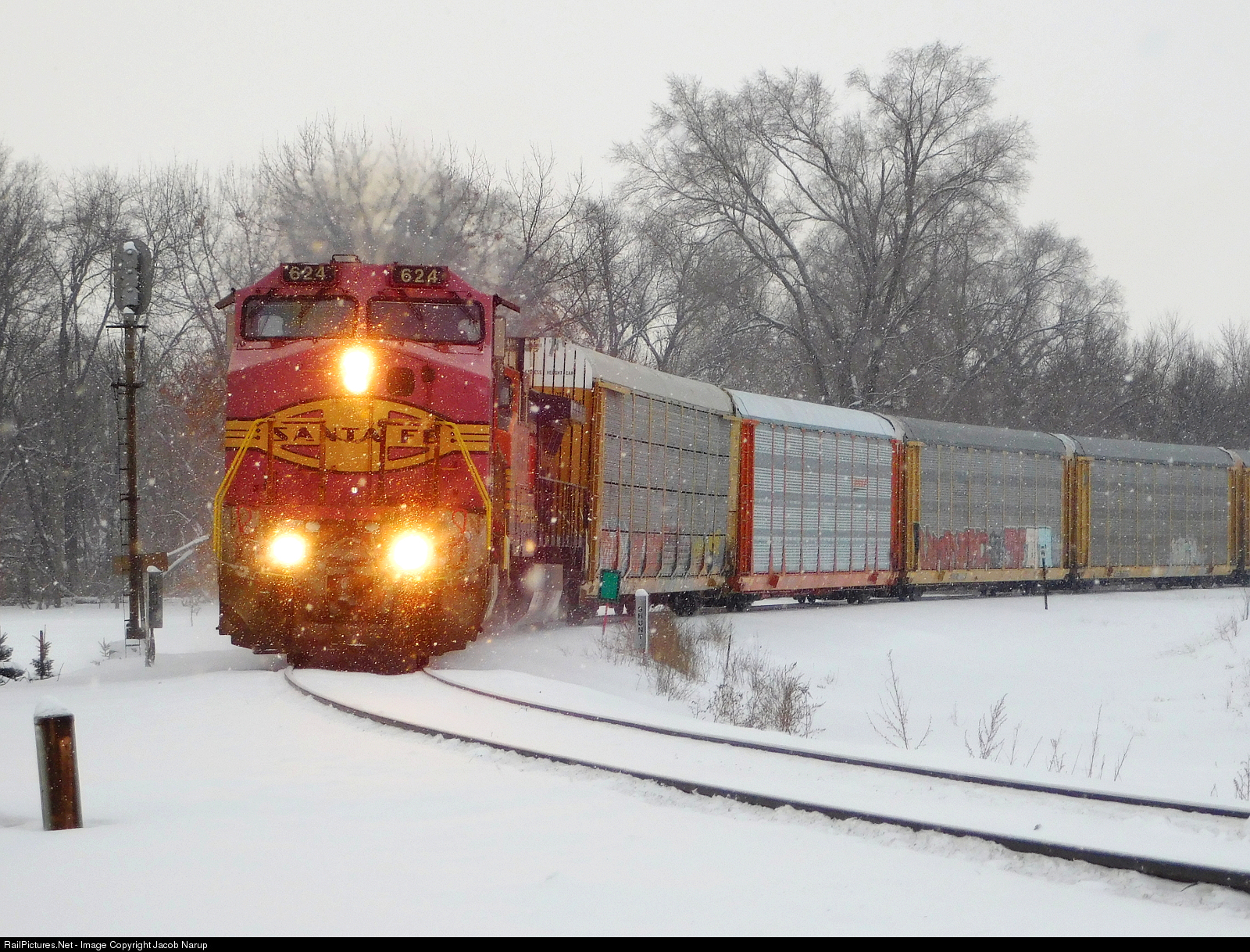 BNSF 624, still sporting good ole Santa Fe paint, leads an autorack train through Colona.