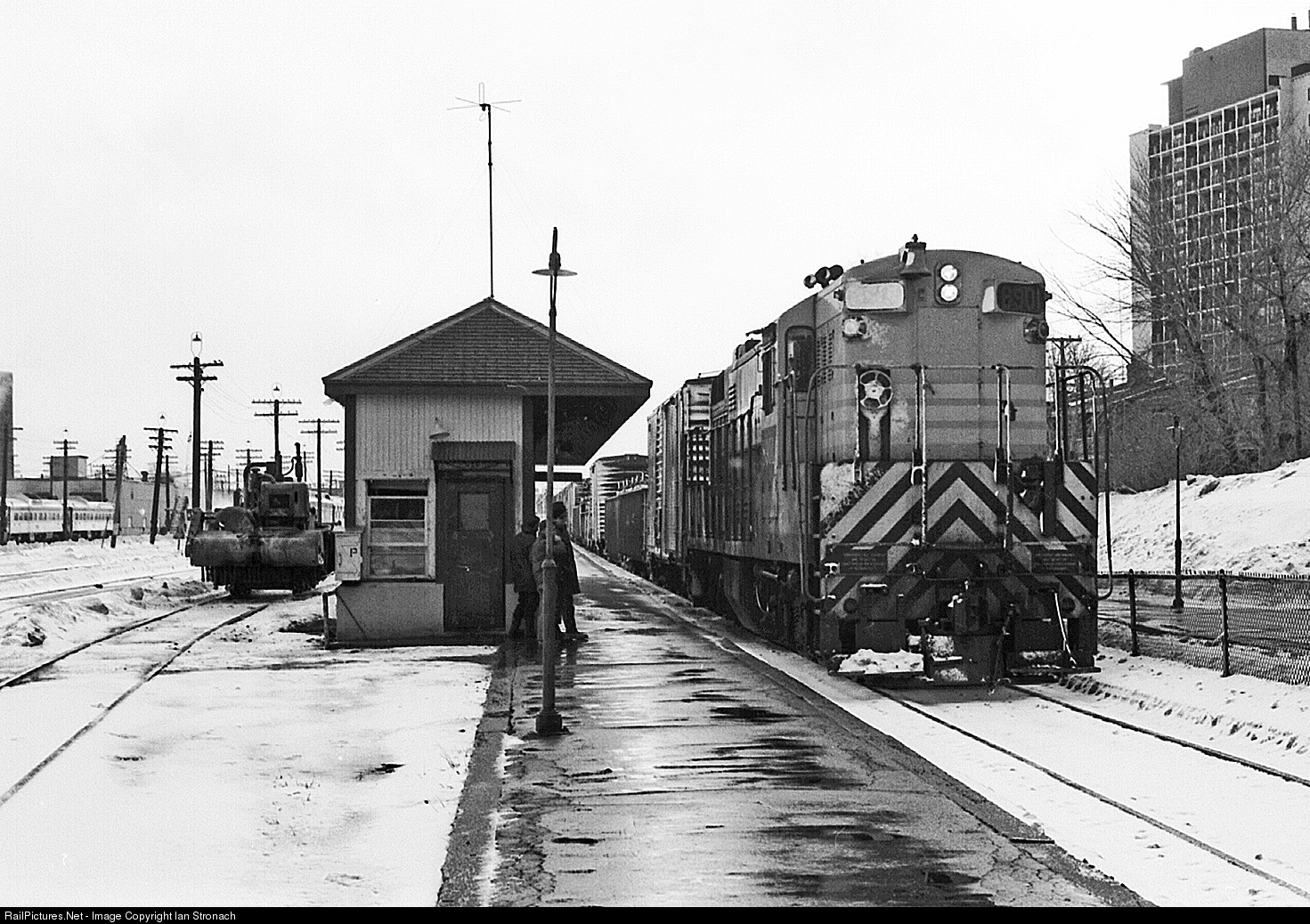 The Trainmasters normally worked the transfers to Hochelaga due to the steep grade on Hochelaga Hill. Here, the 8901 makes a very rare appearance on "The Peanut", the transfer between St. Luc Yard and the Glen Yard, the base for CP's passenger operations in Montreal. The sectionmen outside the yard office take a break from snow clearing to observe this unusual occurrence.