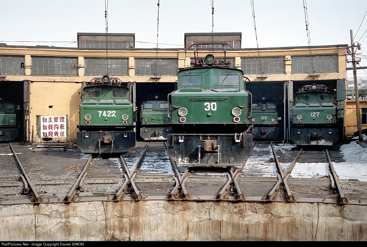 | Line up of East German-supplied locomotives at the electric roundhouse at the Anshan Steel works. An electrified former-steam locomotive roundhouse on an industrial system is a rarity and unfortunately this example did not last much longer beyond 1997. |
