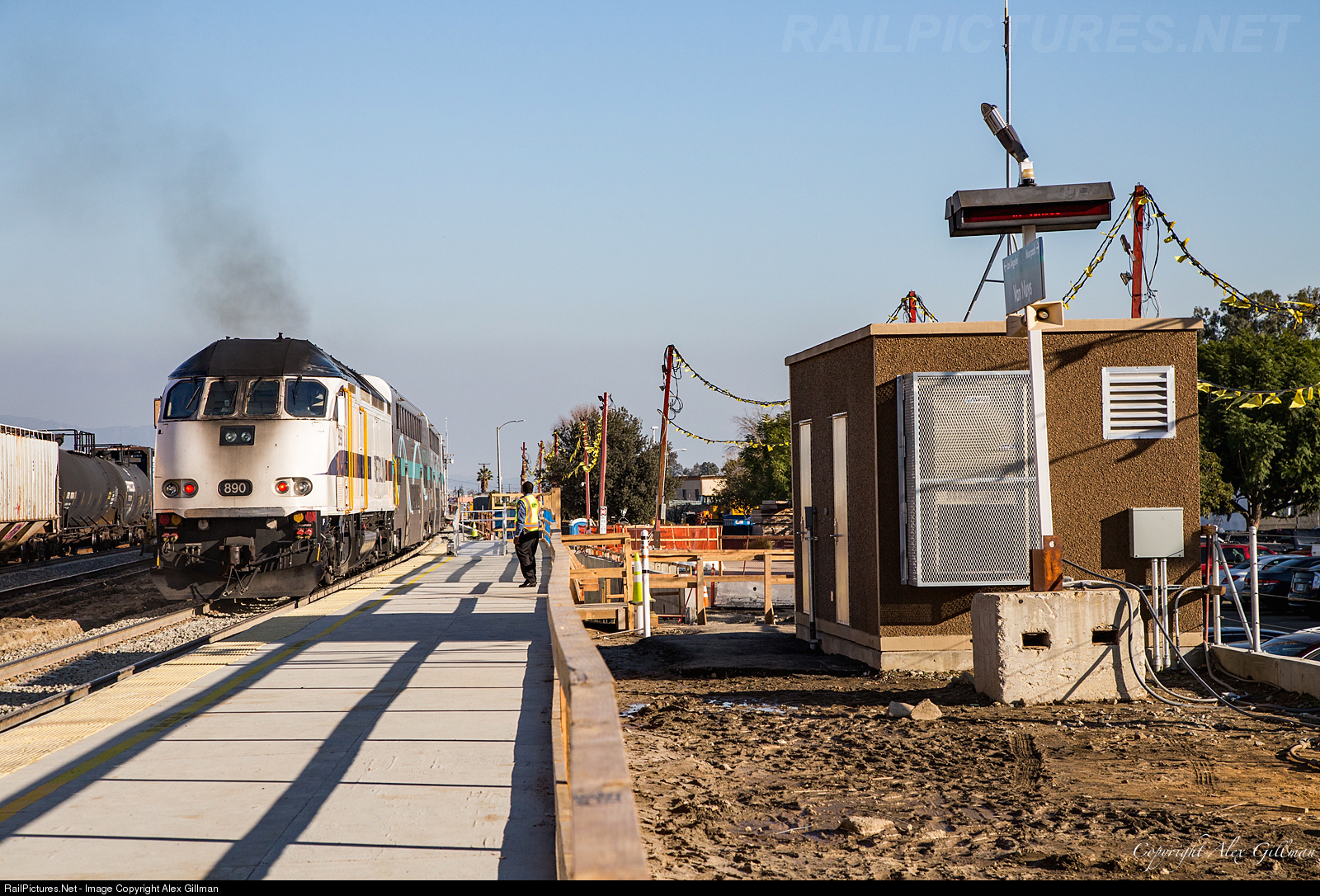 SCAX 890 sends a light haze of smoke skyward as it shoves hard on the rear of Metrolink 116. The southbound commuter train is bound for Los Angeles before it will take on another leg of work during the evening rush. To the right, work on improvements to the configuration of the platform(s) here at Van Nuys continues.