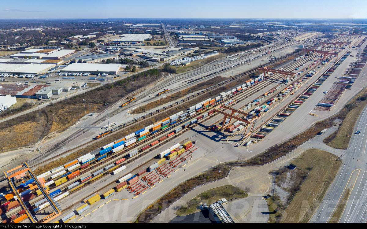 A northbound coal train stops to pick up a new crew at BNSF Tennessee Yard, while several other trains prepare to depart.