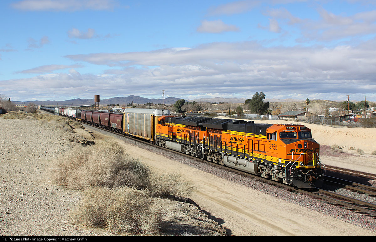 | A westbound BNSF manifest departs Barstow seen from Lenwood hill with a pair of consecutively numbered ET44C4's, 3754 and 3755 on the rear. |