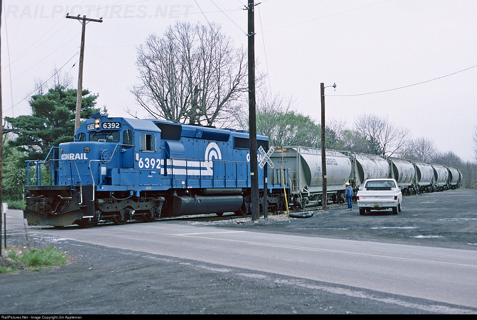 A 6 axle in 4 axle territory! This track, the Watsontown Industrial Track extending east of the Watsontown Secondary, was restricted to 4 axle units. A USF crew was nearby with a trio of SD40-2s at PP&L's power plant, and these Flexi-Flo hoppers for flyash were to be switched around as soon as possible. The crew was given permission and instructed to take one SD40-2 onto the Industrial Track to handle the movement, taking it easy. There were no problems. With the construction of USG's Washingtonville Plant decades later, the Industrial Track has been upgraded to handle 6 axle units pulling synthetic gypsum trains.