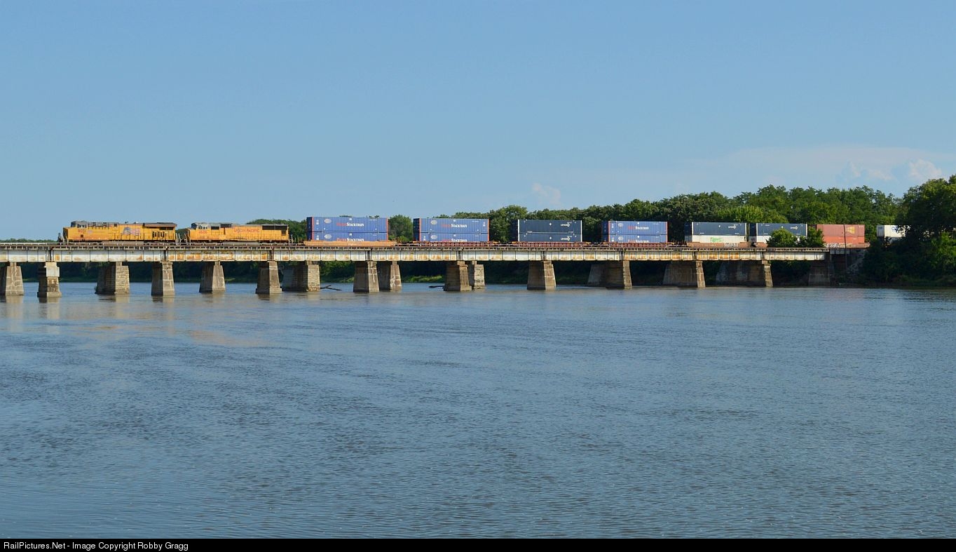 UP 8031 leads ZCIBP east across the Kankakee River.
