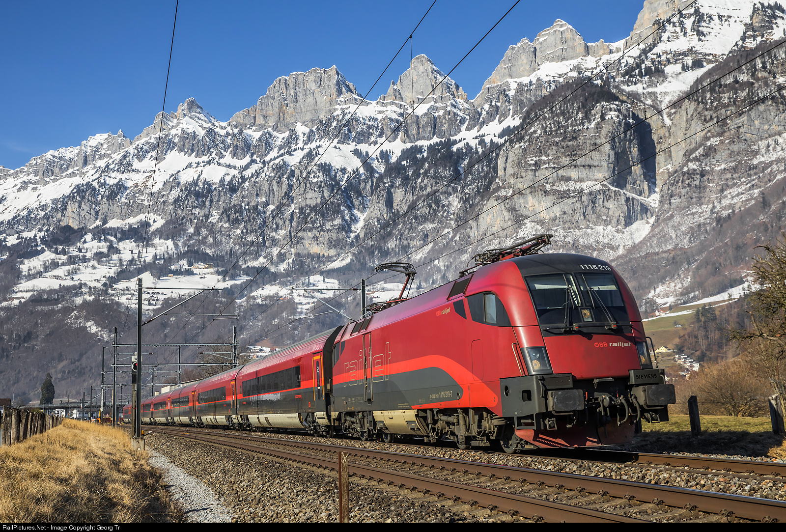 | Siemens "Taurus" 1116 # 219 of the Austrian Railways ÖBB is pulling RJX (Rail Jet Express) 167 from Zürich HB to Vienna and Bratislava hlavna stanica (Hungary) through Walenstadt, with the Churfirsten Frümsel, Brisi, Zuestoll and Schibenstoll in the background.
