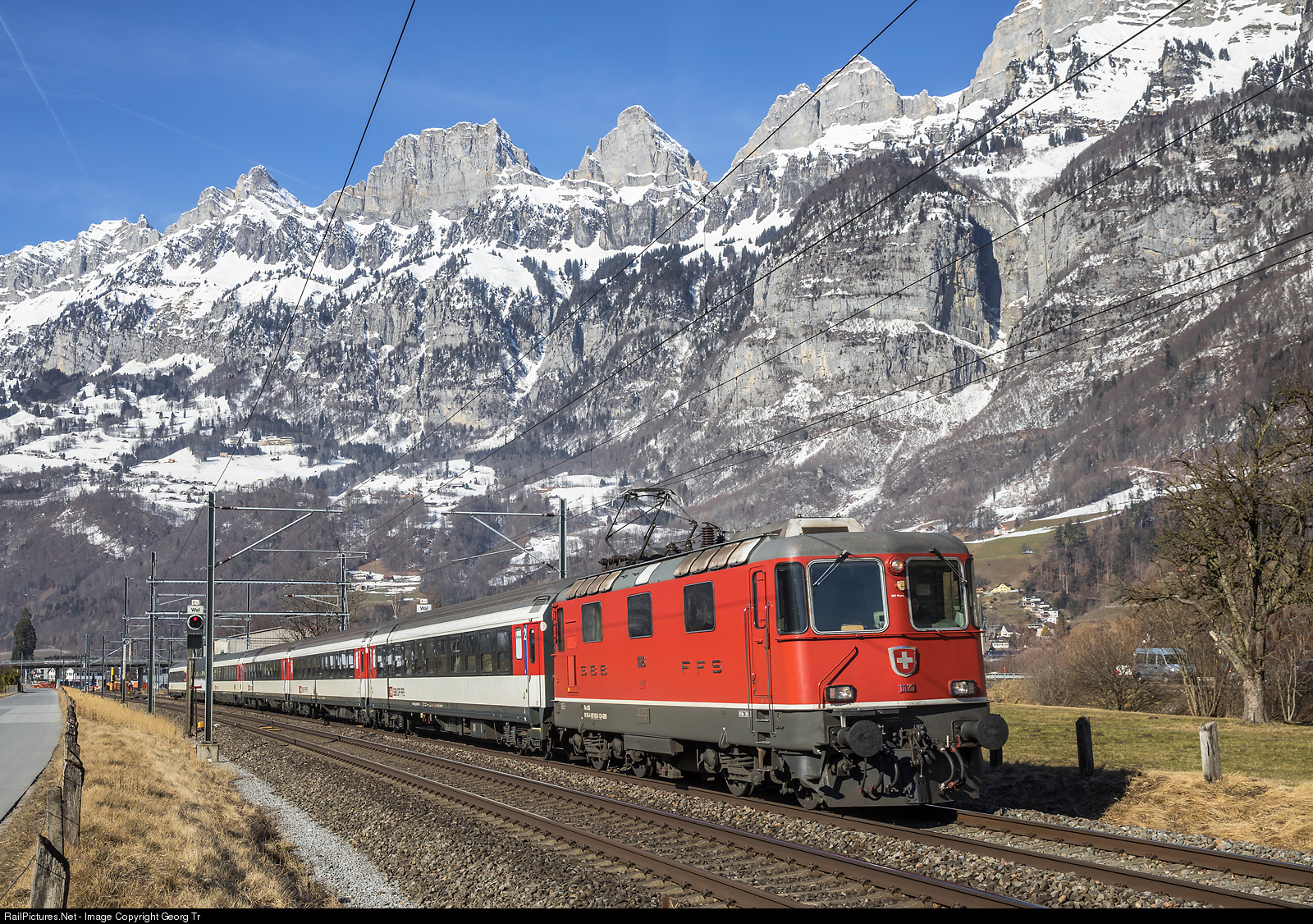 The classic Re 4/4 II # 11126 from the first series (now designated Re 420 # 126) is pulling the Intercity # 921 of the line 3 from Zürich to Sargans-Landquart-Chur, between Walenstadt and Flums, with the Churfirsten Frümsel, Brisi, Zuestoll and Schibenstoll. There are 3 second class Bm ("B 50"), one second class B standard type IV, one Apm panorama car and one first class A standard type IV in the train.