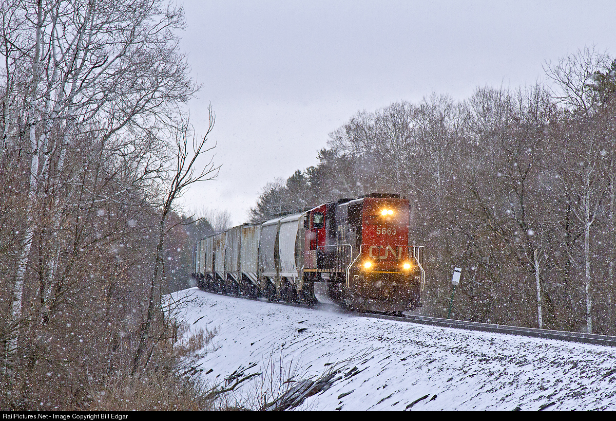 | CN 5663 reminds one of the days when CN Geeps were set up to run long hood first. The local operating west out of Chippewa Falls started the day with some lingering snowfall. The train will stop and switch a lumber company at Colfax before continuing to Wheeler with the covered hoppers for sand loading. |