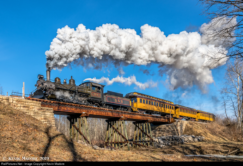 High over Butternut Creek. US 152 trails a steamy, white plume against a cobalt blue sky as she rumbles across the recently rebuilt Butternut Creek Trestle on the run back to Crossroads Village. This is the largest bridge on the roughly 4 mile Huckleberry Railroad and it's located just about a 9-iron shot from the Eastern Turning Loop. Until recently, this particular photo would have been next to impossible because of thick woods and brush on the south side of this bridge. Thanks to the Huckleberry Railroad Crew, a lot of that brush has been cleared, opening up a pretty spectacular view of the passing trains. In addition, the personnel walkway and safety fence are located on the north side of the bridge, providing an unobstructed view on the sunny side. I wonder if that was by design? :)