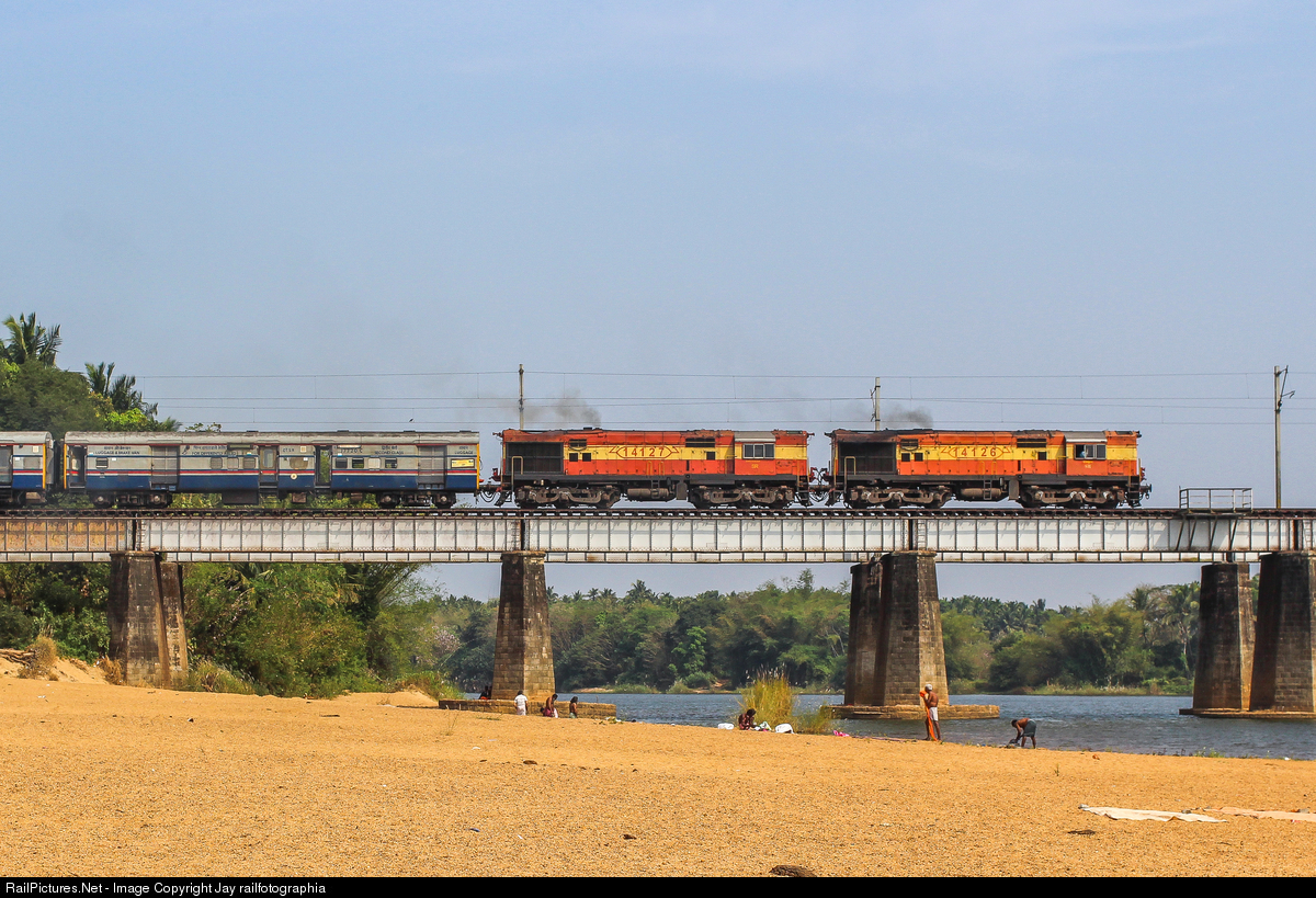 Lightly smoking ERNAKULAM WDM-3A pair 14126 and 14217 crossing the bridge with Thiruvananthapuram Central bound Venad Express