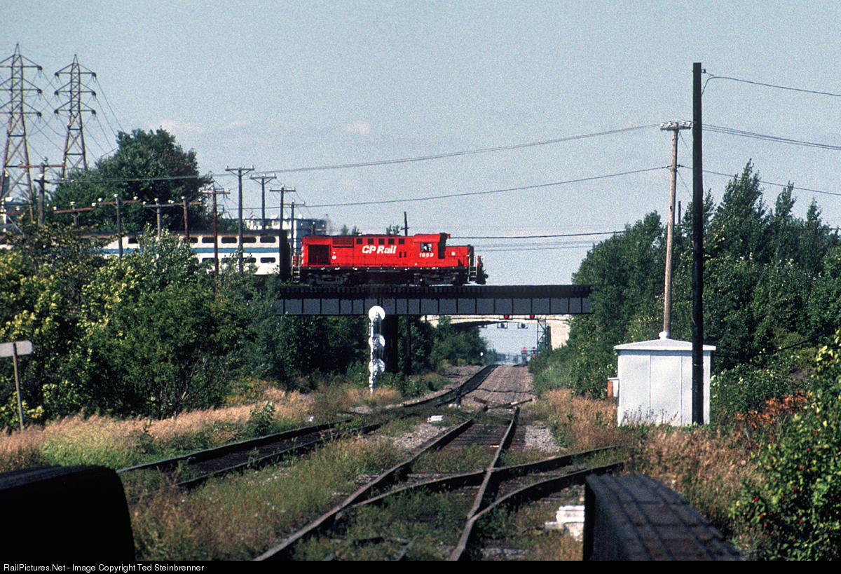 This photo reminds me of all the great photos Ian Stronach has posted from early 1970's Montreal. On one of our trips to Montreal, my father and I spent some time in Lachine where the CP Adirondack Subdivision east towards the Maritimes crosses over the CN St. Hyacinthe Subdivision east towards the Maritimes. This picture is from the south side of the bridge facing north towards North Junction and St. Luc Yard. Borrowed CP RS-18u 1853 leads a MUCTC commuter train on the Vaudreuil Subdivision over the Adirondack Subdivision on its way to Windsor Station. The connection from the Adirondack Subdivision to the Vaudreuil Subdivision veers off to the right in the foreground. One can see that there is quite a grade on this connection used by the D&H and CP passenger trains of yesteryear and Montreal Transit Corporation commuters and Amtrak today. This is my father's picture. R.T. Steinbrenner photo