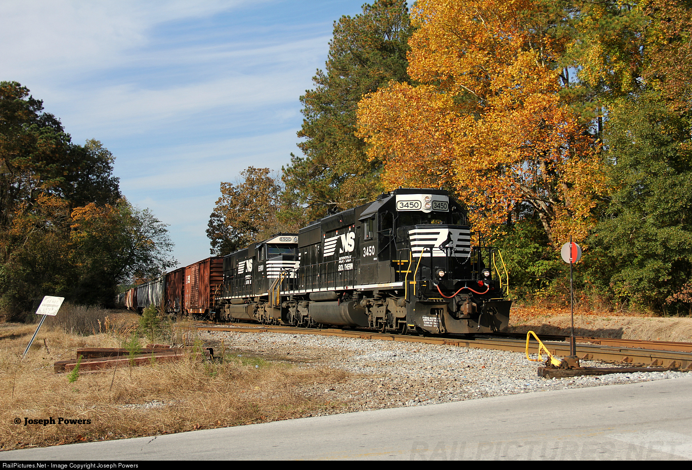 Norfolk Southern local A54 is on the GS Branch at the N 33rd St. grade crossing in Gadsden, Alabama. Once the train clears the crossing, the switch in the foreground will be thrown and the train will make a reverse move towards the stub end track NS Siskin Yard to interchange cars with the shortline Alabama and Tennessee River Railway.