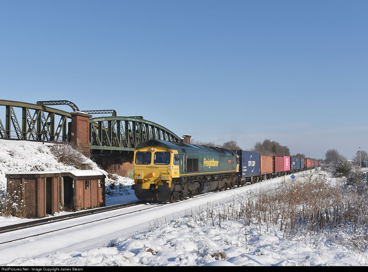 66534 is seen at Worting Junction with a Freightliner bound for Southampton. Engineering work should have diverted trains via Andover (under the flyover) however due to the cold temperatures the work was abandoned and the usual route through Winchester remained open. |
