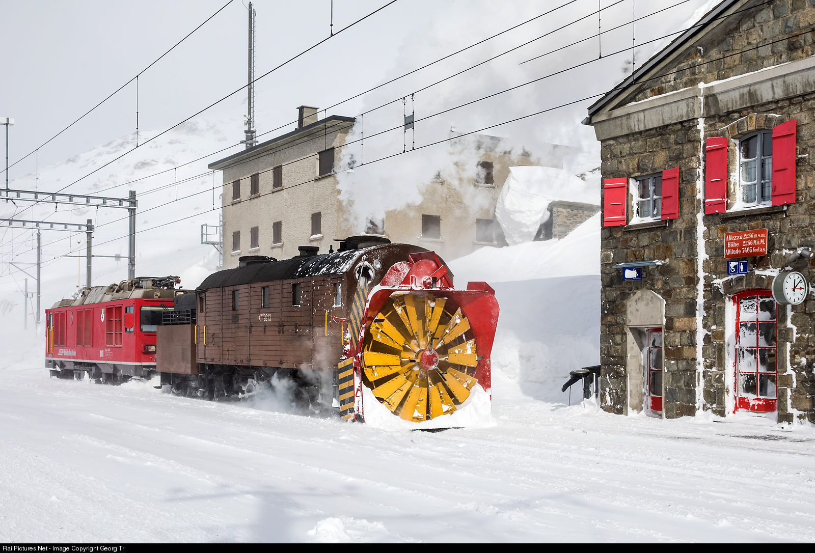 Self propelled steam rotary snow blower Xrot d # 9213, built by SLM Winterthur in 1910 for the then independent Bernina Railway, shoved by dual power diesel/electro locomotive Gem 4/4 # 801, is arriving at Ospizio Bernina on 2256 meter a.s.l. during a staff training run.