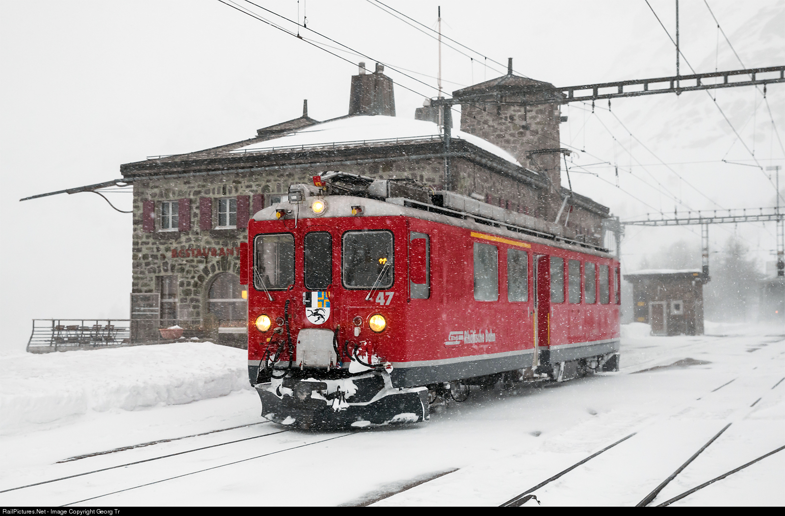 | Railcar ABe 4/4 # 47 at Alp Grüm, returning from Pontresina back to Poschiavo, after the service for the steam rotary snow blower event of this day. |