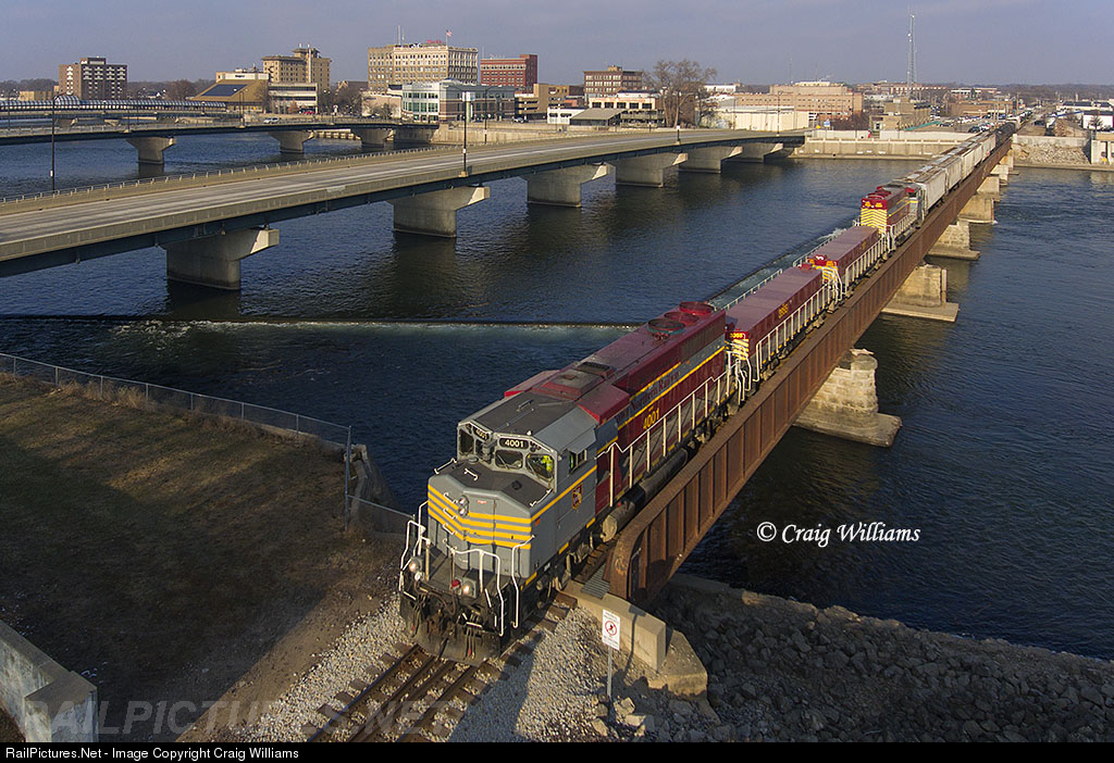 The South Crew is running alittle late today on their northbound trip from Cedar Rapids to Waterloo. Once at Waterloo the crew switched out their train and then made a delivery to the UP yard at Linden. Now the crew heads back to Bryant with overhead traffic from the UP that will go on the South Crew tonight for Cedar Rapids. Seen here crossing the Cedar River in downtown Waterloo.