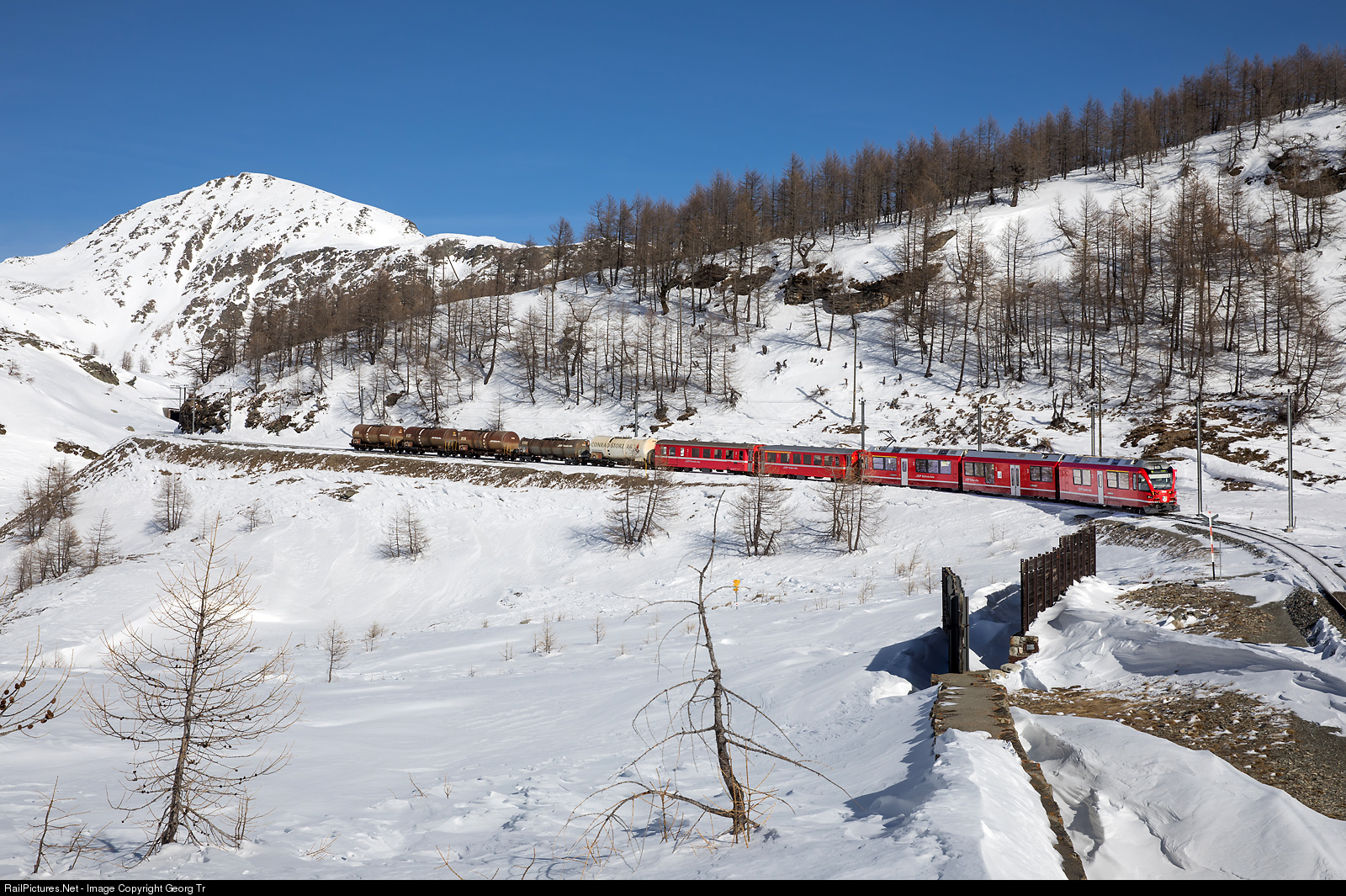 | "Allegra" railcar ABe 8/12 # 3505 is pulling the mixed passenger/freight train 1633 from St.Moritz to Tirano, which has 5 empty fuel oil tank cars in the rear from Pontresina to Campocologno. |