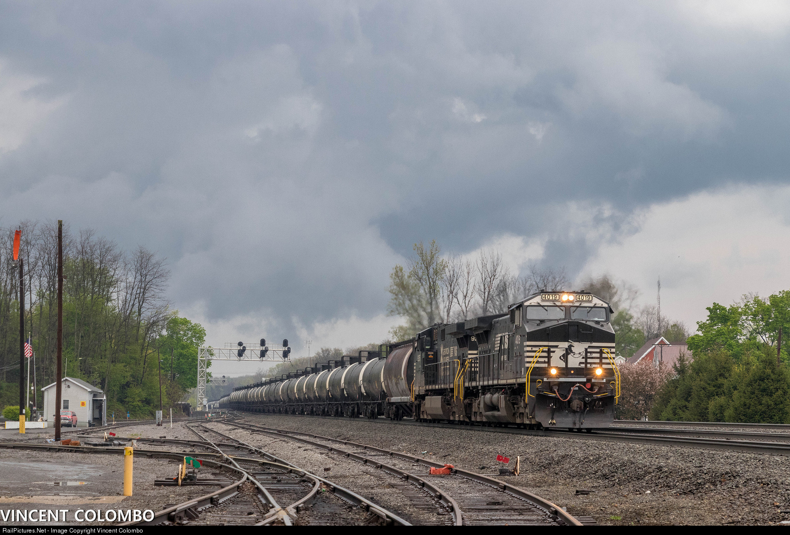 Norfolk Southern AC44C6M 4019 leads a unit tank train past the NS helper facility at Cresson under stormy skies.