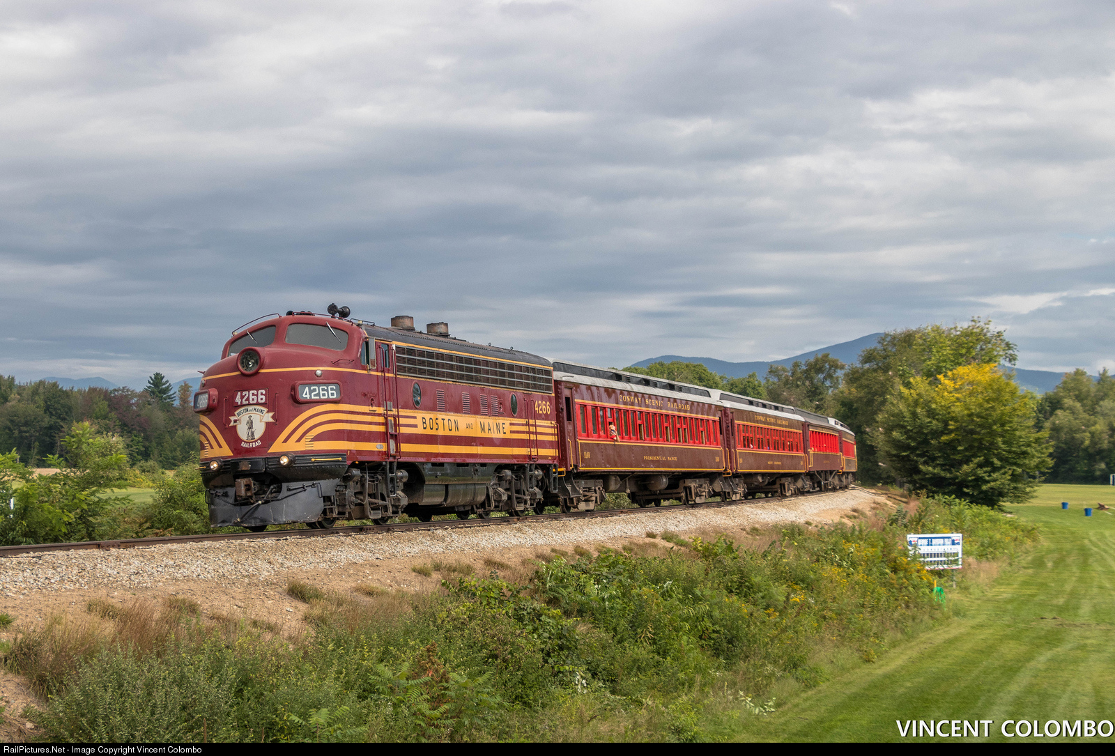 Conway Scenic F7 4266, dressed in Boston and Maine colors, rounds the bend at the middle school in Conway, NH. 4266 is handling the first Valley Train of Railfan's Weekend and will shortly arrive the B&M depot at Conway.