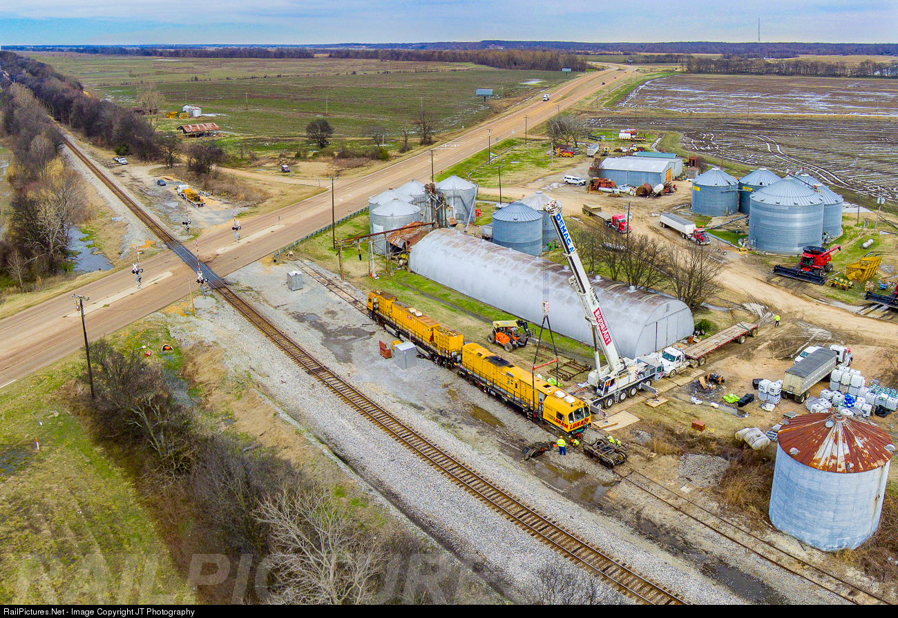 Fixing the axle of a Loram Rail Grinder. Canadian National and Loram have hijacked a small delta farm and turned it into a temporary shop as they fix up this rail grinder which would appear to have a locked axle or some similar problem.