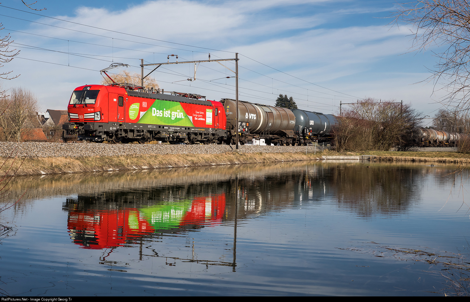 | Siemens "Vectron" 193 # 312 of the DB Cargo in a special "Das ist grün" paint scheme is pulling train 44081 with 20 empty fuel oil tank cars from Häggenschwil-Winden via Romanshorn-Winterthur-Bülach-Koblenz to Basel shunting yard G (BRBG), running along the pond at Riedt near Erlen. The train run on behalf of DB Cargo Schweiz Gmbh. |