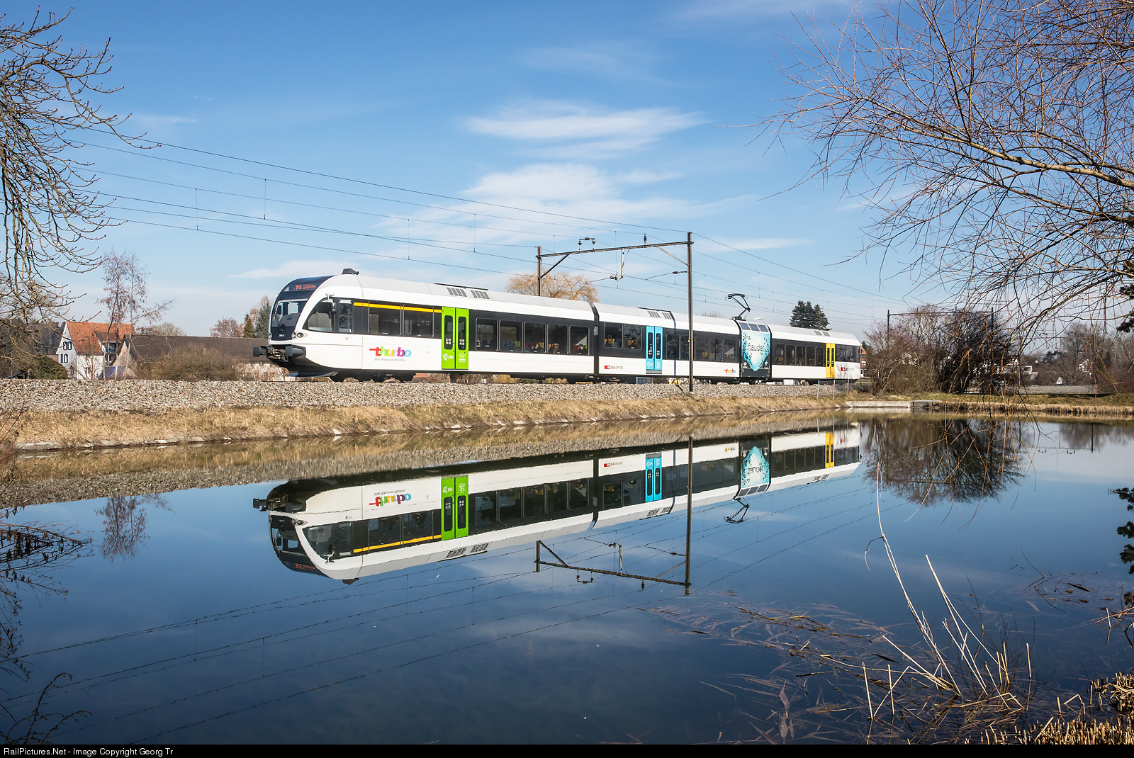 | Articulated lowfloor railcar "AKL" RABe 526 # 794 of Thurbo running as S 7 # 11744 from Rorschach via Romanshorn to Weinfelden along the pond at Reidt near Erlen. On the power modul is a publicity paint scheme for "Flauder Mint" mineral water from Gonten. |