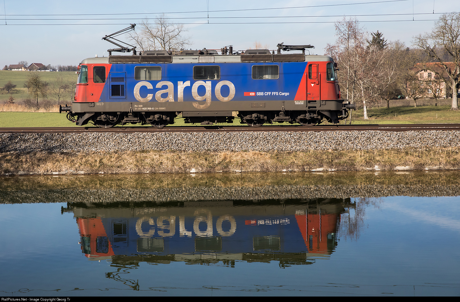 | Re 420 # 268 (Re 4/4 II # 11268) of SBB Cargo is running along the pond at Riedt near Erlen. The locomotive is running from Frauenfeld via Romanshorn-St.Gallen to Gossau (SG). |