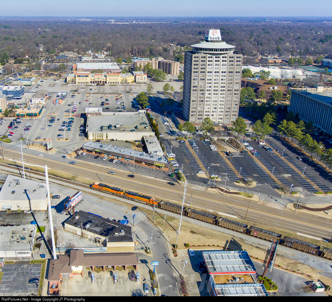 BNSF 8798 leads a westbound coal train down Poplar Avenue past the i-Bank Tower.