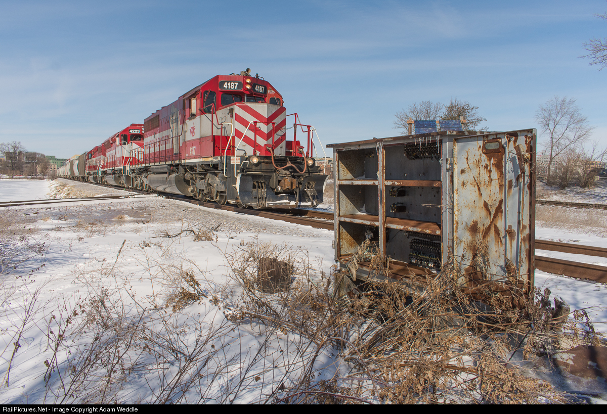 MX is just a shadow of what it once was. Back in the day, this was a high traffic interlocking between the Chicago & Northwestern and the Milwaukee Road. Both railroads had a causeway that led to this junction. Traffic movement was controlled by signals and the Monona Tower Operator. This decrepit box is about the only remnants of the signal system. Present day, the diamond is within yard limits and only sees a few trains a week. WAMX 4187, 4223, and 4191 are pictured leading 50 grain loads over the former Milwaukee Road trackage that connects the present day Prairie Sub with the Madison Sub. Movement over the former MILW at MX is not all that common. It is typically only done when WSOR runs unit grain trains that bypass their yard in Madison.