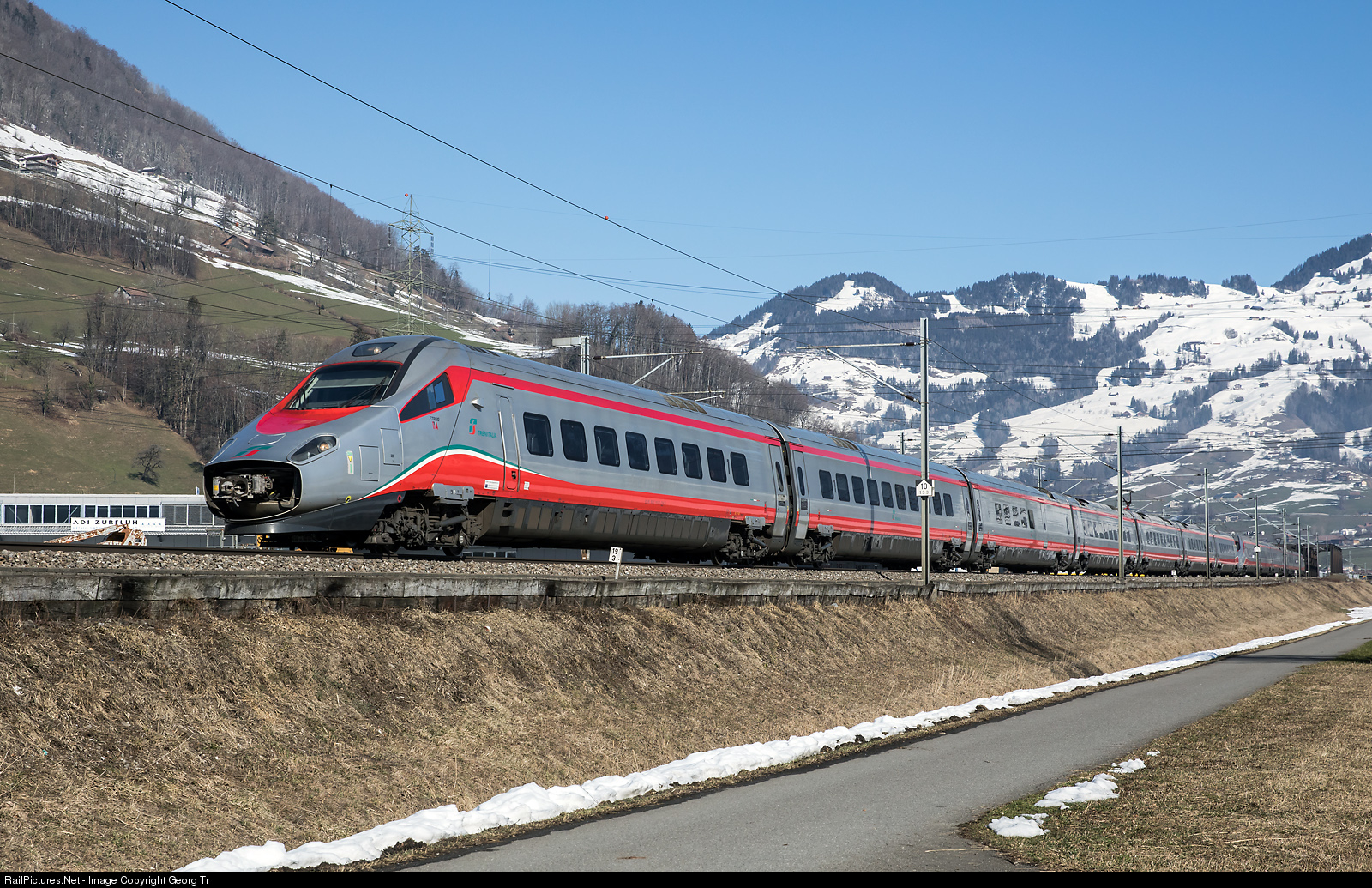 | Highspeed tilting train ETR 610 # 011 and # 002 in multiple traction of Trenitalia are running the Eurocity 17 from Zürich to Milan on the Gotthard line between Schwyz and Brunnen. |