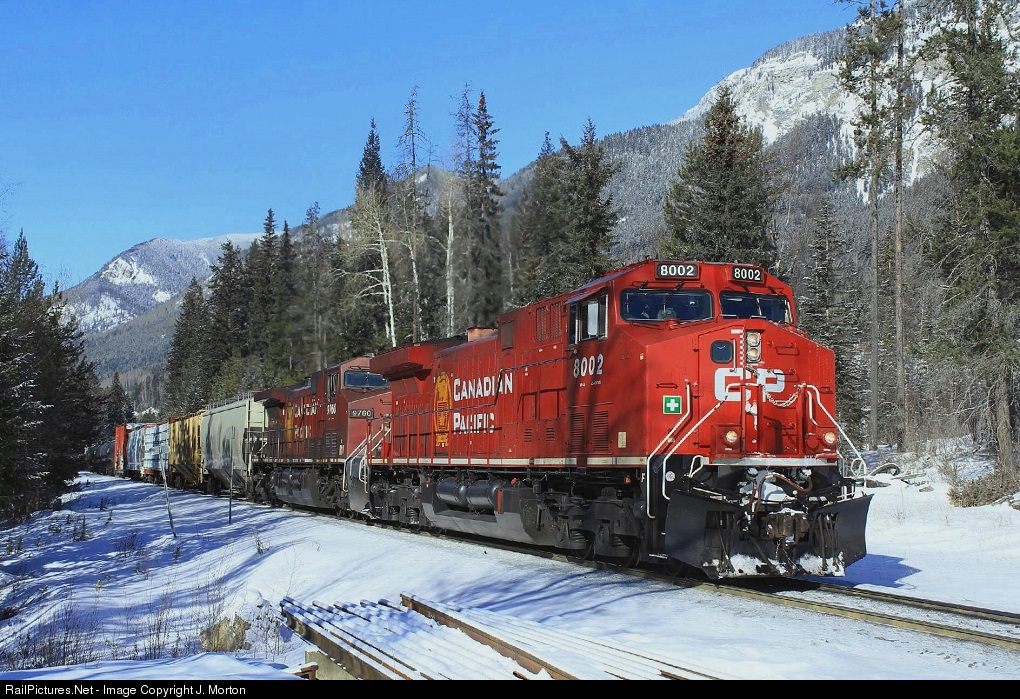 | CP 8002 leads its train east up the grade between Palliser and Leanchoil. I consider this photo a little bit of a miracle. For the last 2 weeks or so, it has been quite cold and snowy here in Canada. On this date, it got up to only -9°C. More chilling temperatures and snow on the way this weekend. All the while, the trains keep going. |