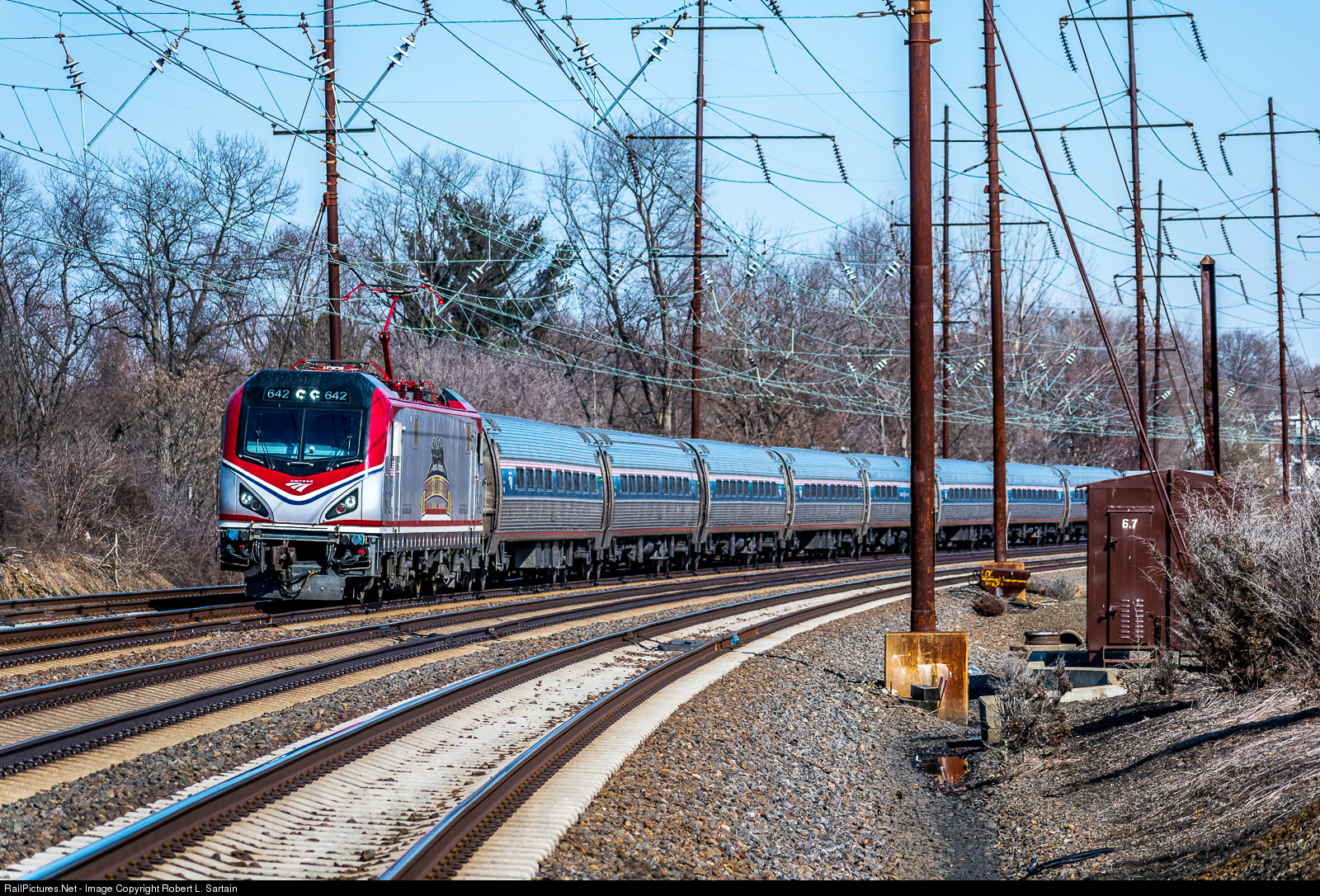 Amtrak's "Salutes Our Veterans" motor, ACS-64 642, may wear a unique paint scheme among her peer Cities Sprinters, but she earns her keep like any other motor. She's in charge of Northeast Regional train 195(16) on a pleasant February day.