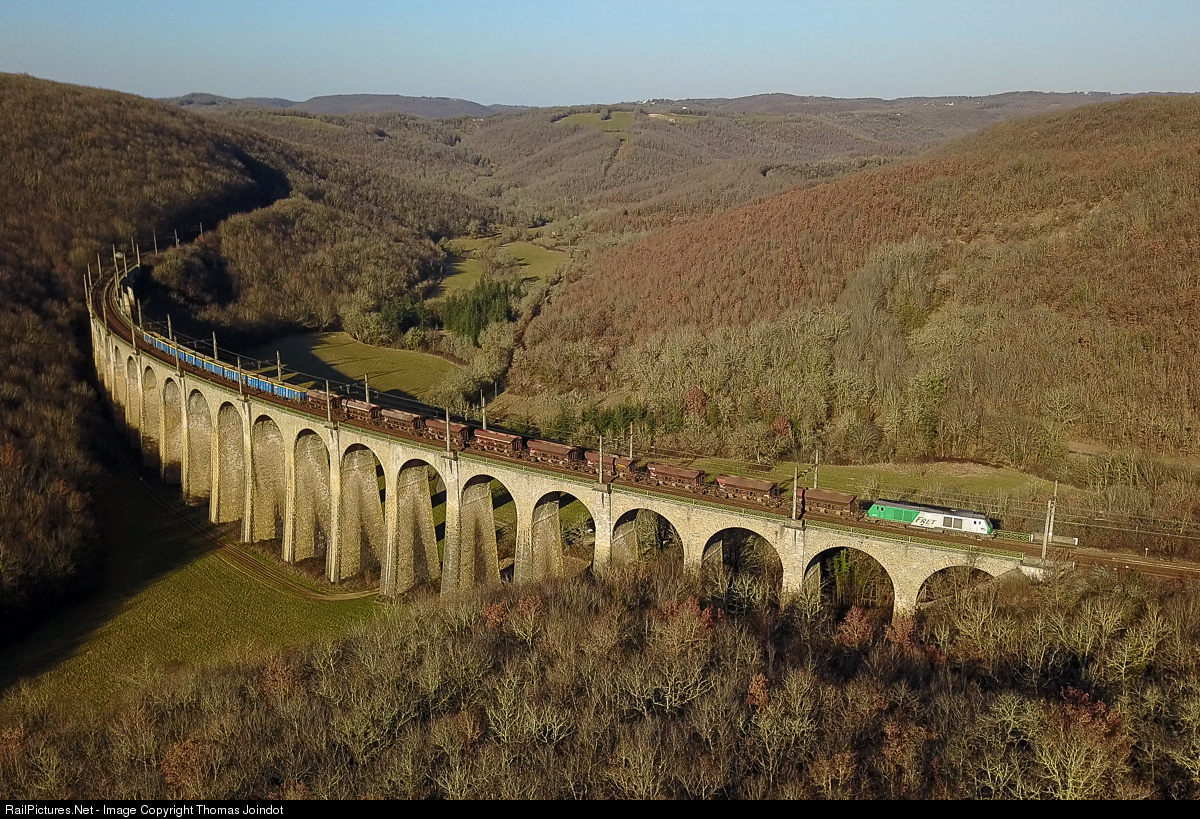 Freight train #72454 St Jory - Thiviers quarry runs over the Boulet viaduct near Souillac