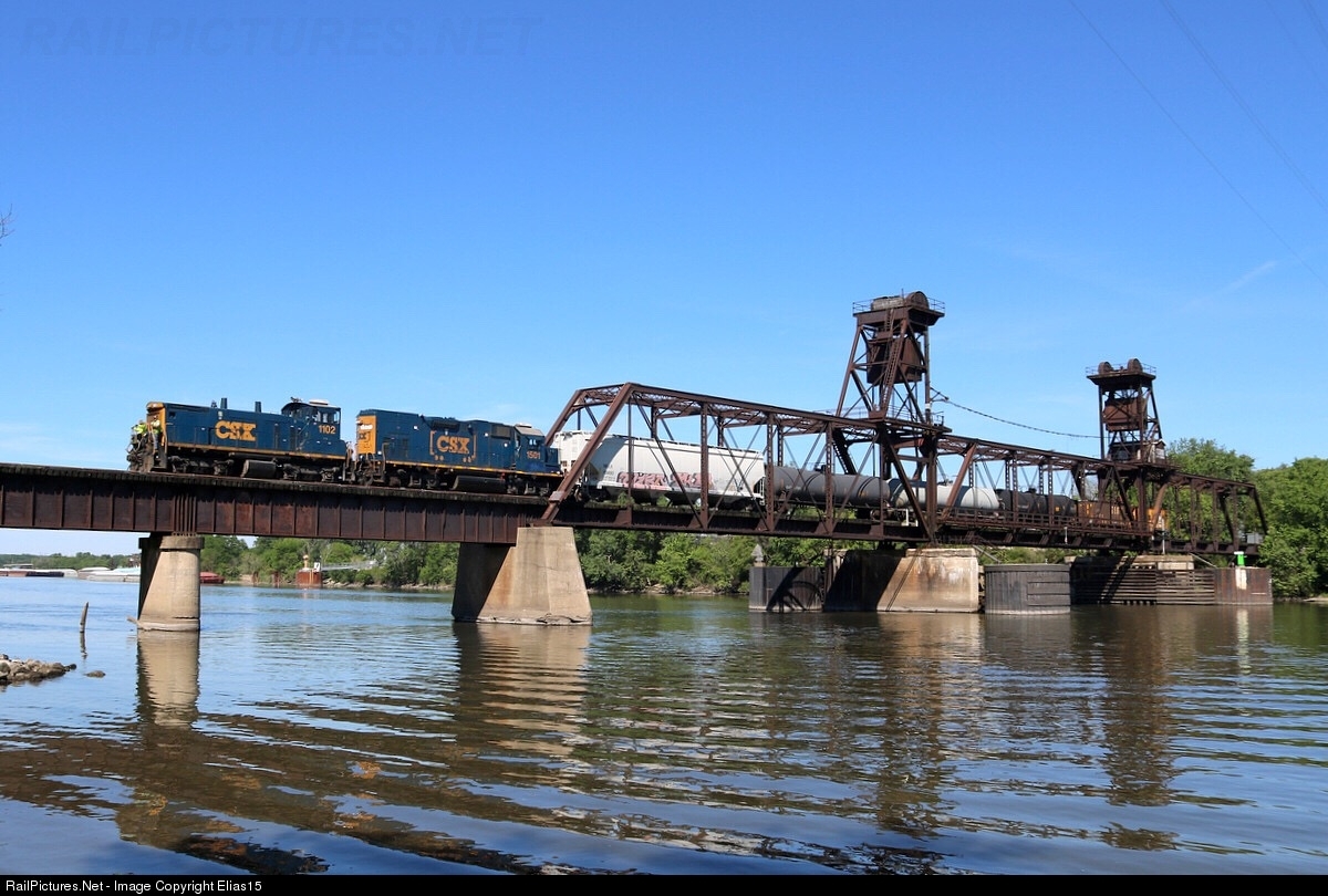 A CSX SW1500 leads the local on the former Kankakee & Seneca trackage over the Illinois River.