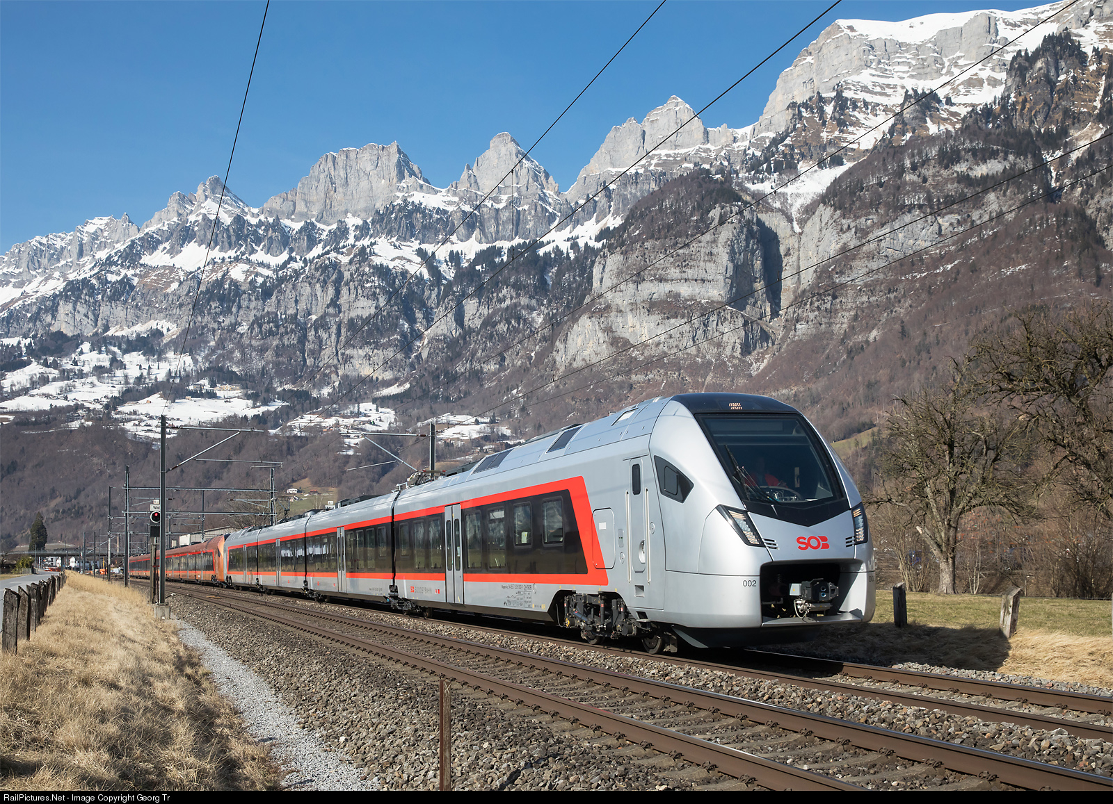 "Flirt 3" from Stadler Rail for the Südostbahn (SOB) on a transfer run between Walenstadt and Flums, with the Churfirsten mountain range in the background. RABe 526 # 002 in silver and RABe 526 # 103/203 in copper paint scheme in multiple traction.