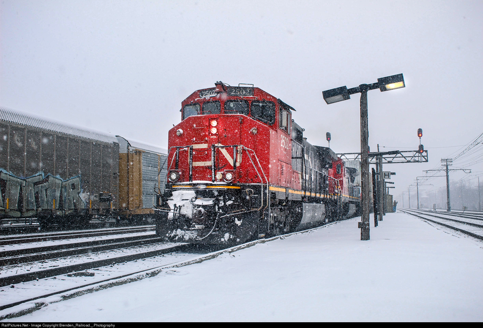 | As a snowstorm quickly covers Southern Illinois, a Canadian National intermodal train led by a two Canadian National GE's (C44-9WL, and a C40-8) slowly accelerates past Homewood's Amtrak station. Switching in Markham Yard can be seen in the Yard Lead a few tracks over. |