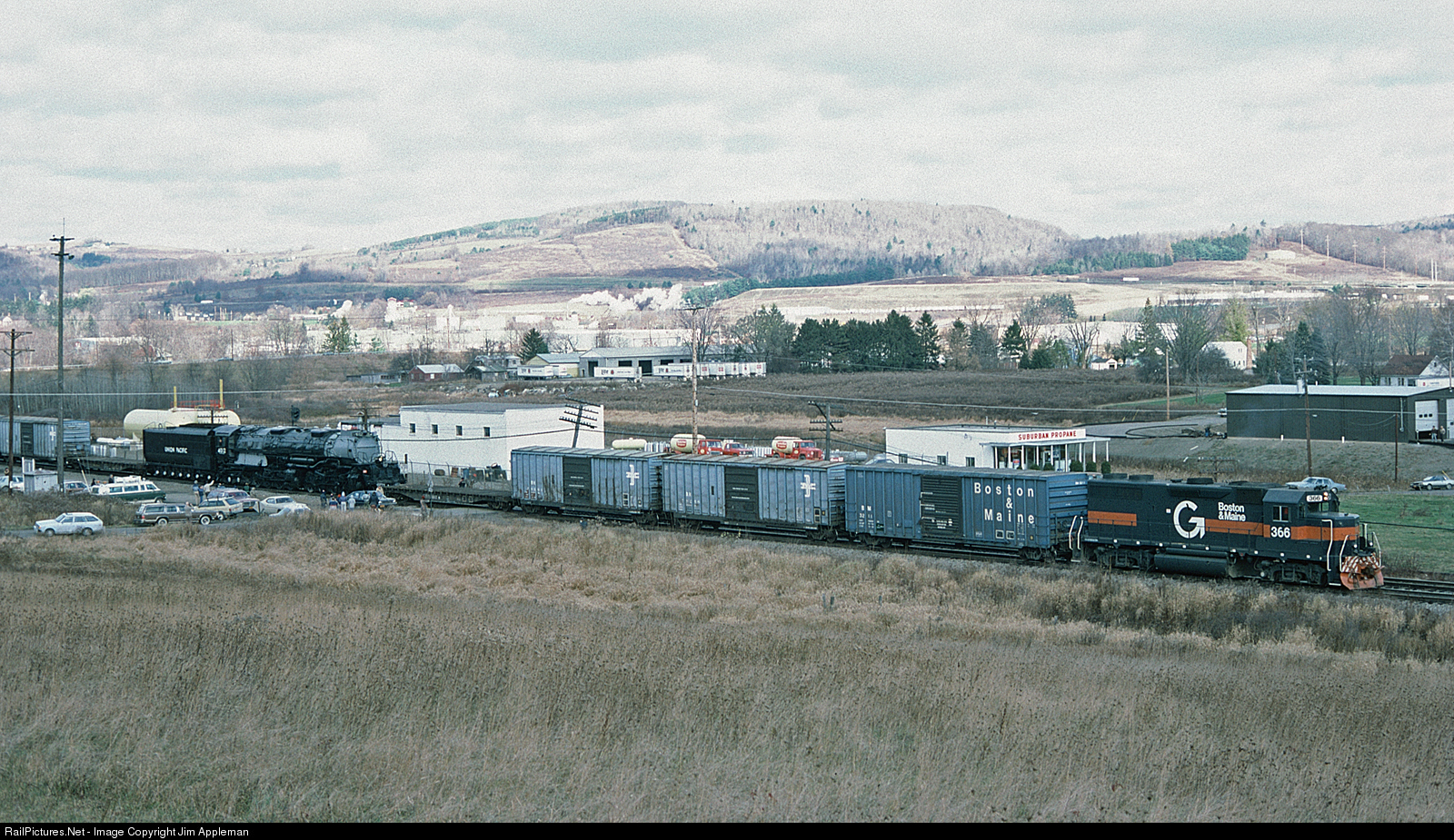 B&M 366 departs East Binghamton Yard for Scranton, PA with idler cars and UP 4012 4-8-8-4 on the final leg of the "Big Boy's" journey from Bellows Falls, VT to its new home at what will become Steamtown National Historic Site. Also note the B&M idler boxcars sans graffiti.