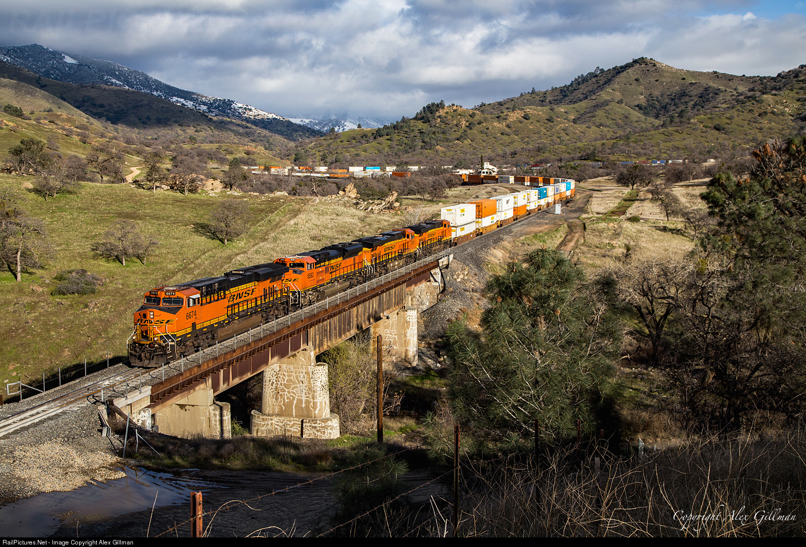 | With threatening skies looming in the background, BNSF 6674 eases its northbound Q train downgrade over the 1908-built bridge and into Rowen as the length of its double stack consist can be seen still snaking through the horseshoe curve in the background and into Woodford. |