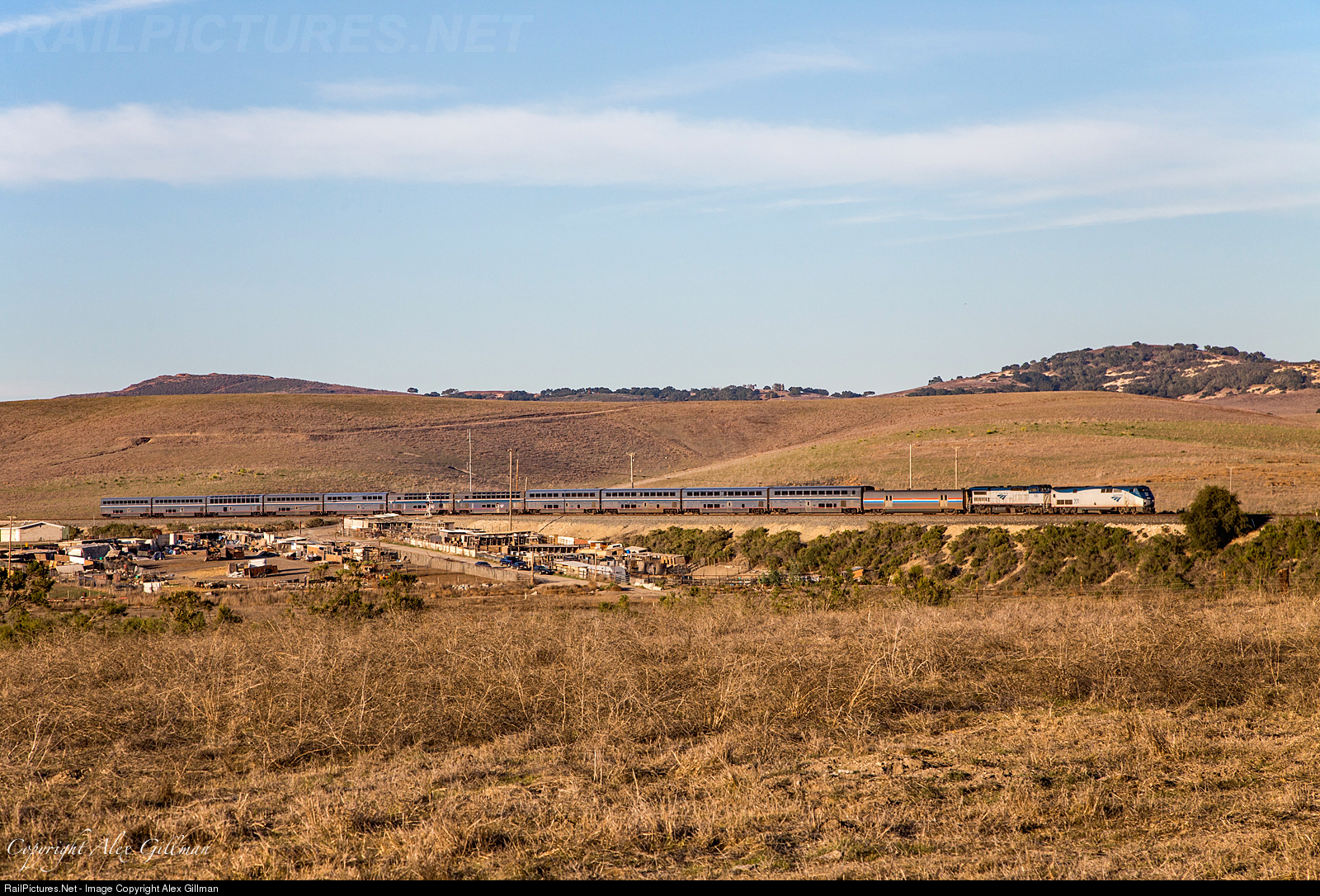 | Catching the last rays of sunlight at Casmalia, Amtrak's southbound Coast Starlight hustles south with the last revenue run of the famed Pacific Parlour Cars sandwiched in the middle of this evening's consist. |
