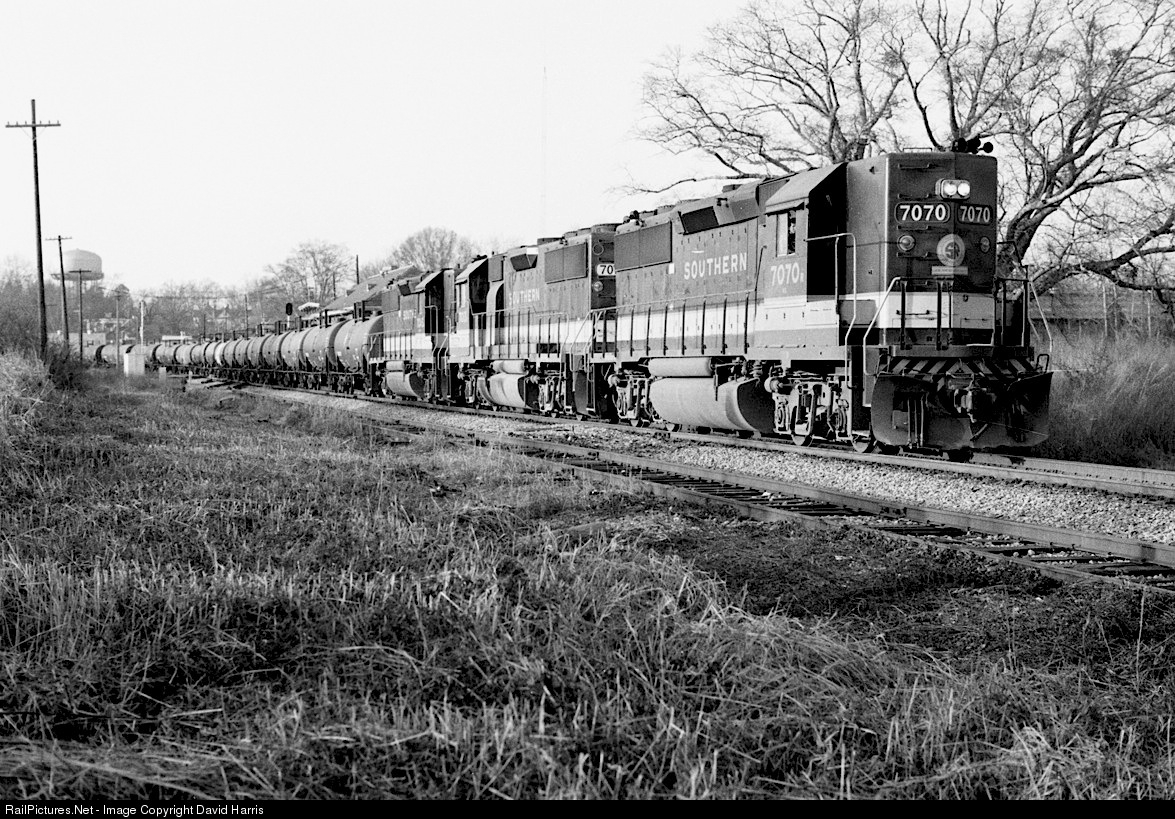 EMD touted the GP50 as a do-anything locomotive, but in actual service it seemed more runner than dragger. The model did not live up to the manufacturer's hype and proved unpopular on many roads, but Southern (and later NS) squeezed a lot of use out of their fleet. In the photo, three GP50s head an eastbound unit tank train on the former Central of Georgia main between Birmingham, AL and Columbus, GA.
