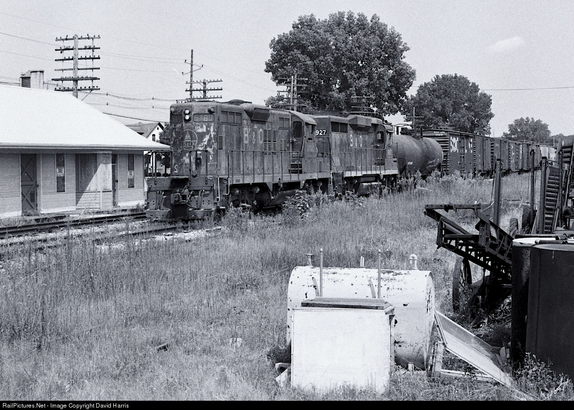 Chessie System acquired a number of new GP15s in the early 1980s, and assigned several of them to a captive pool operating on the ex-Rock Island line west of Joliet. Once they arrived, the Henry turn (which operated out the main to Bureau and then down the Peoria branch to Henry) was powered virtually every day by 2 or 3 of the bright, little geeps. Before the GP15s arrived, though, it was a little more interesting, with any of Chessie's older geeps liable to show. On this late summer day back in 1982, a GP9 and GP30 lead the westbound leg through Depue, one of the many small towns in this part of Illinois that were struggling to survive the loss of their industries.
