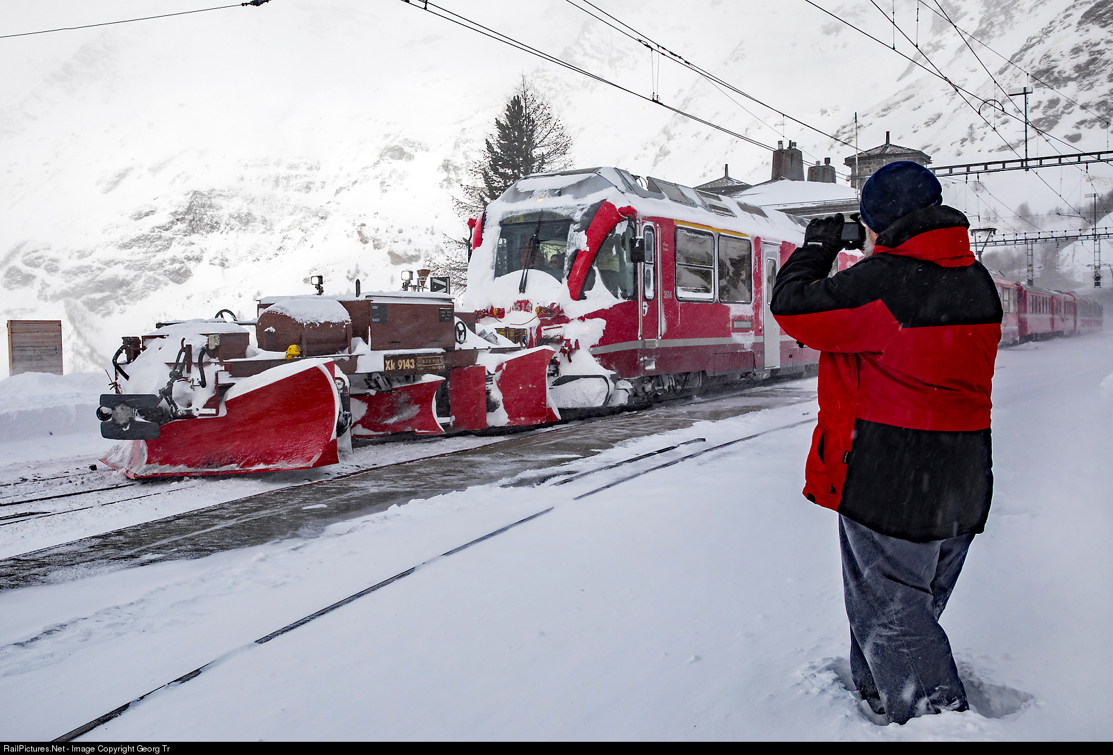 | Real railfans can neither be discouraged from cold nor snow to indulge in their hobby. Train 1617 from St.Moritz to Tirano with railcar ABe 8/12 # 3514 and flanger plow Xk # 9143 is leaving Alp Grüm. |