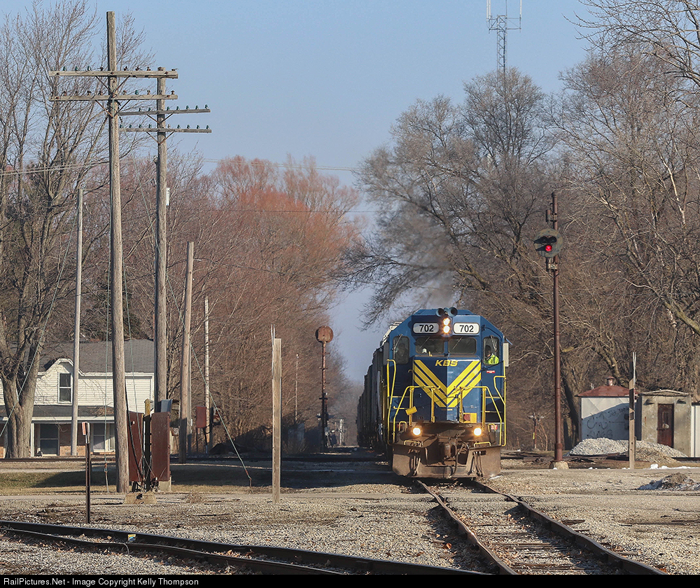 KBS 702 leads a southbound KBS train through the heart of downtown Sheldon, Illinois. The heritage of the line is really showing as the 702 passes the NYC G Head and old code line. The small town of a little over 1,000 people is host to where the old NYC crossed the PRR, now KBS and TPW.