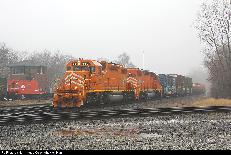 CN who? A pair of Elgin, Joliet & Eastern SD38-2's, both still wearing the fan favorite orange with white chevrons, head west through Griffith, Indiana on a rainy afternoon.