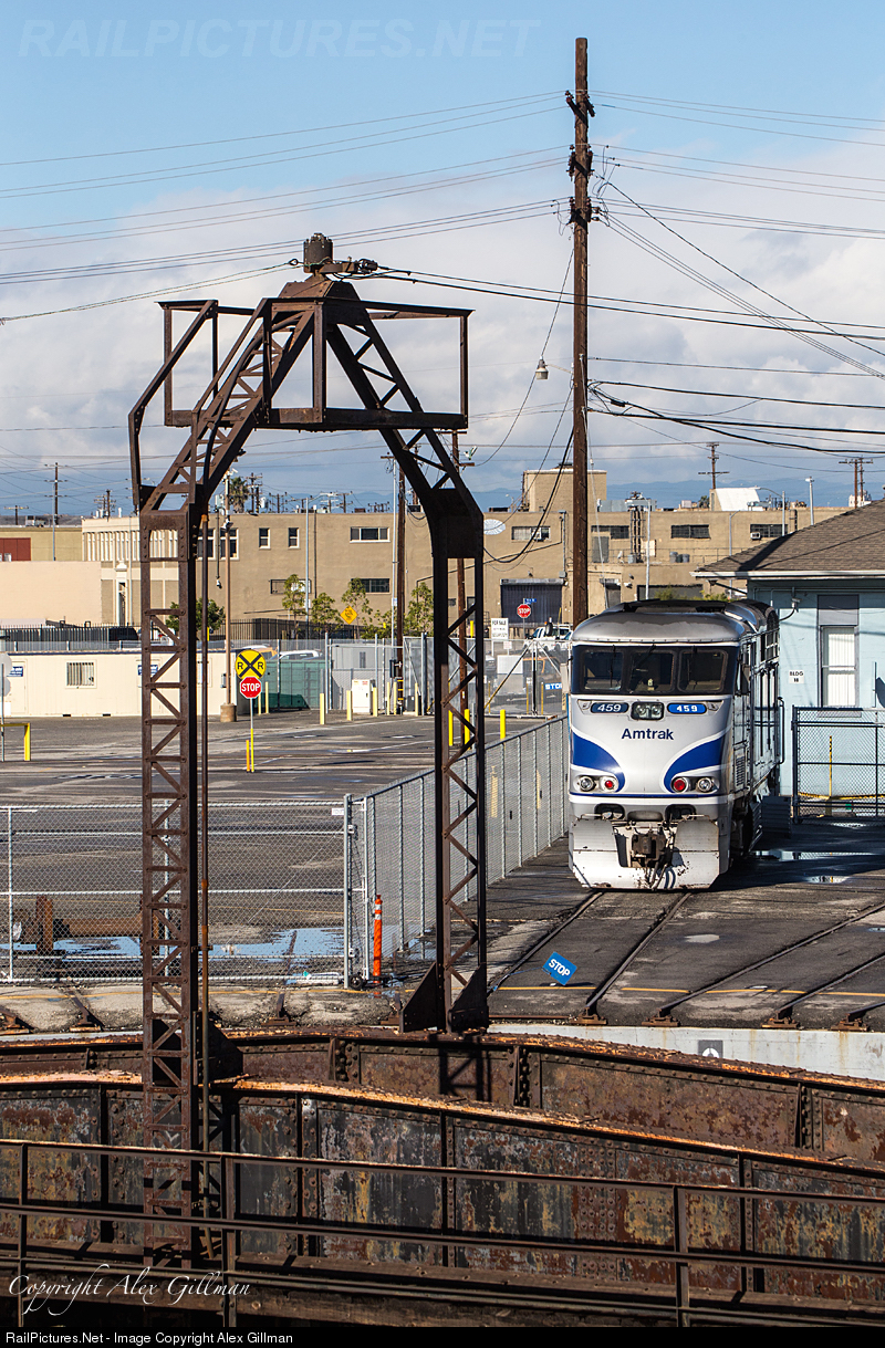 | AMTK 459, one of only two F59PHi's still on Amtrak property in Los Angeles (at the time the photo was taken), bathes in the morning light across from the Redondo turntable as it's prepared for its final trip out of town for Chicago. Of particular interest for the 459, a makeshift numerboard has been created on the fireman's side of the unit after the standard one was shattered. |