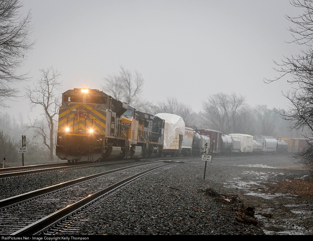 | KCS 4023, one of three remaining grey ghost ACe's, glides on the downhill portion of Otis Hill as it moves out of the foggy country and into the big lights of Chicago. |